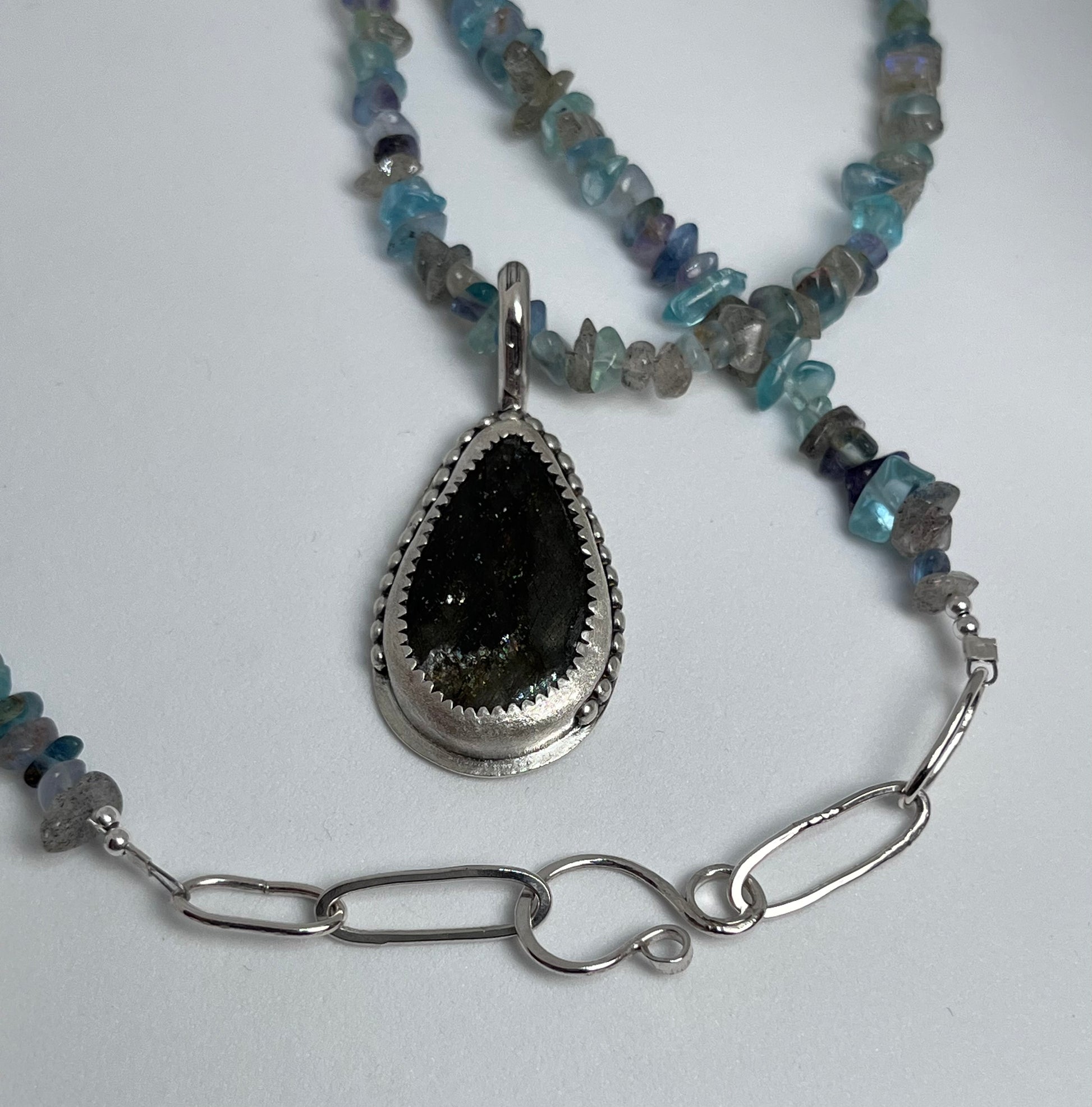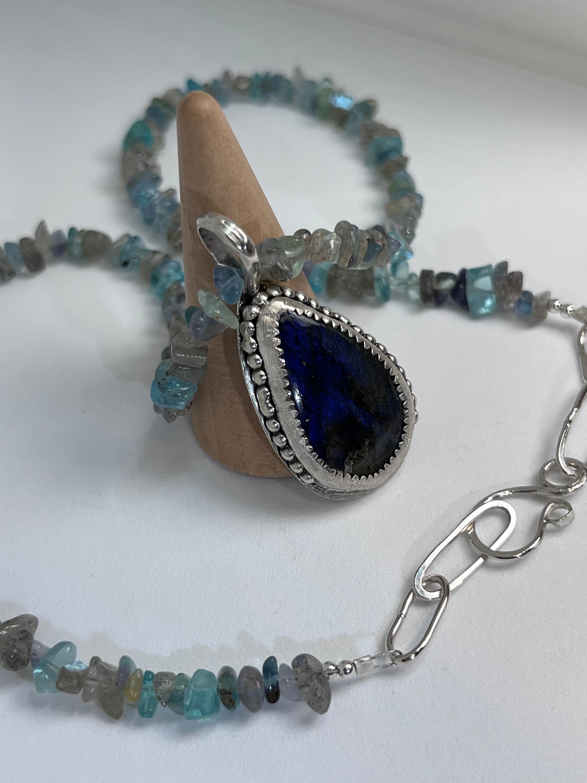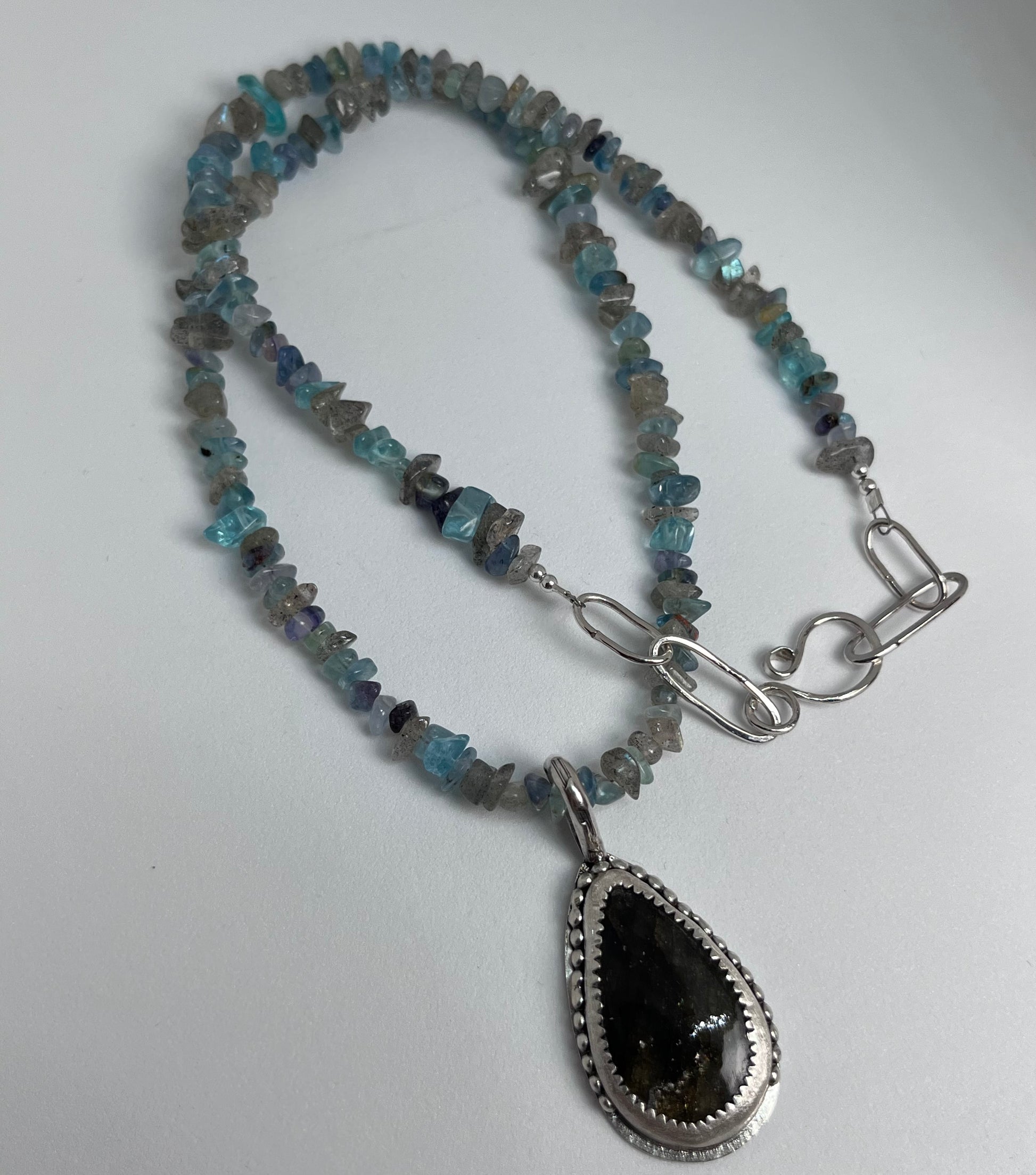 Handmade one of a kind necklace with Labradorite chips, Apatite chips, Fluorite chips and four sterling silver sphere beads, all strung on sturdy 7 strand beading wire. Featuring a lovely deep blue Labradorite stone pendant in a sterling silver serrated and diamond textured bezel and beaded band. The back has a soldered .925 stamp accent and hand forged bail.
