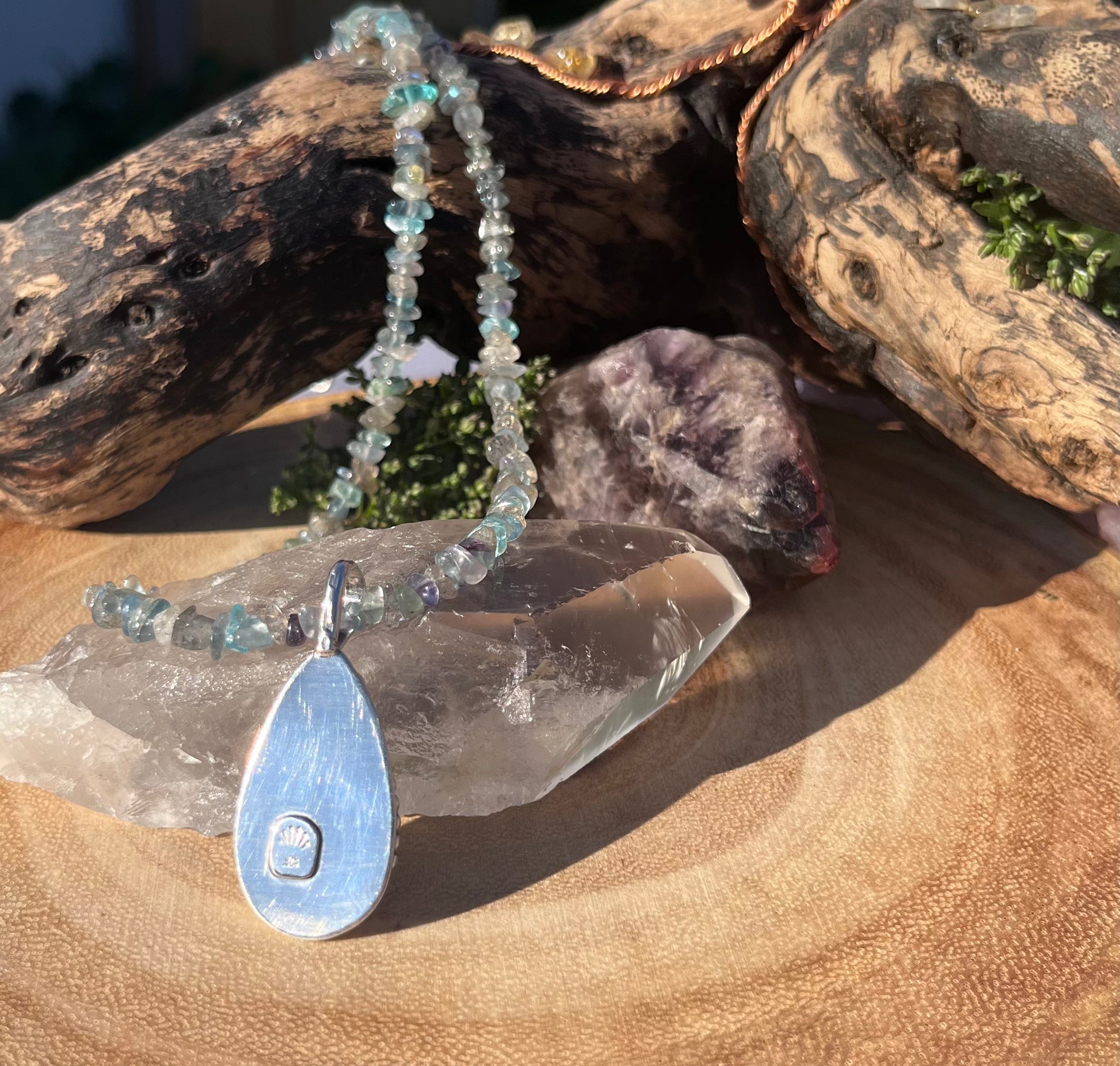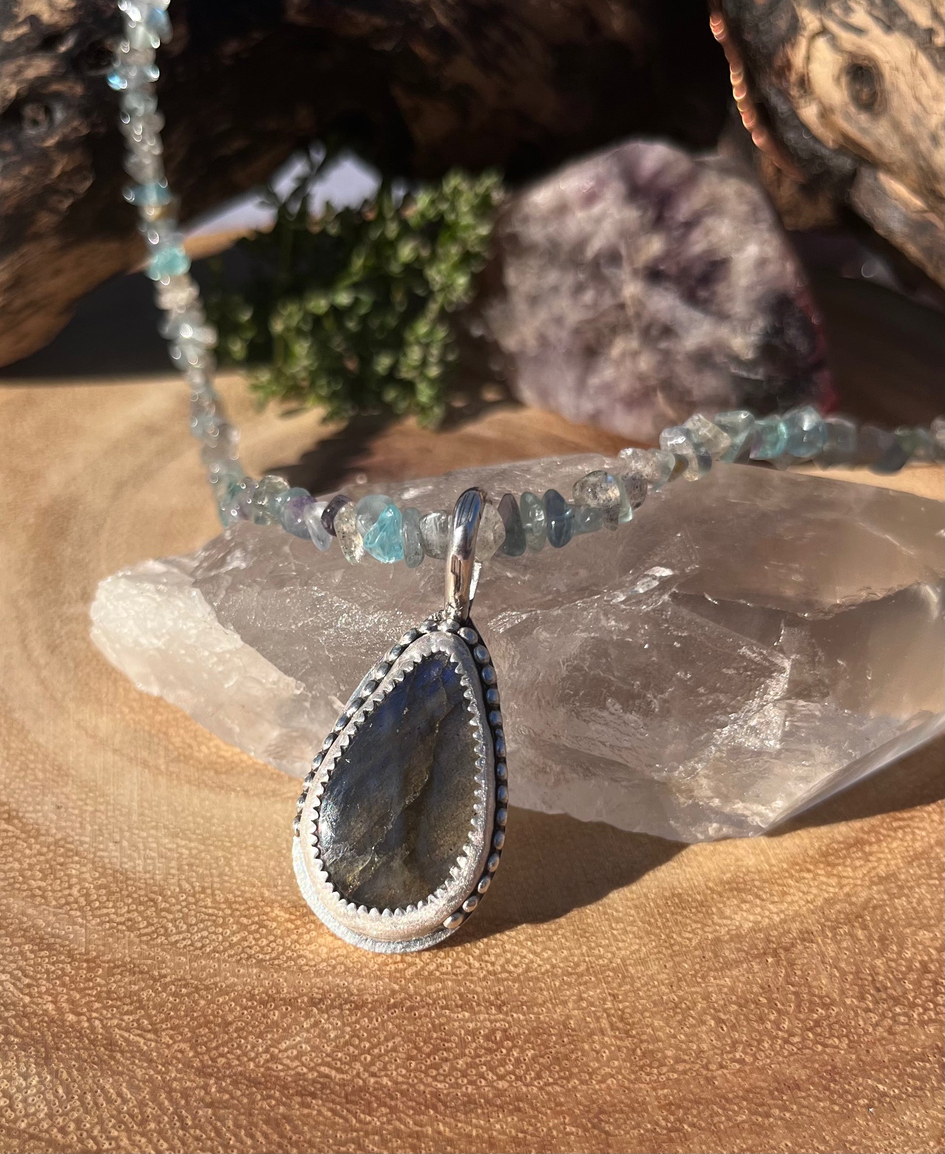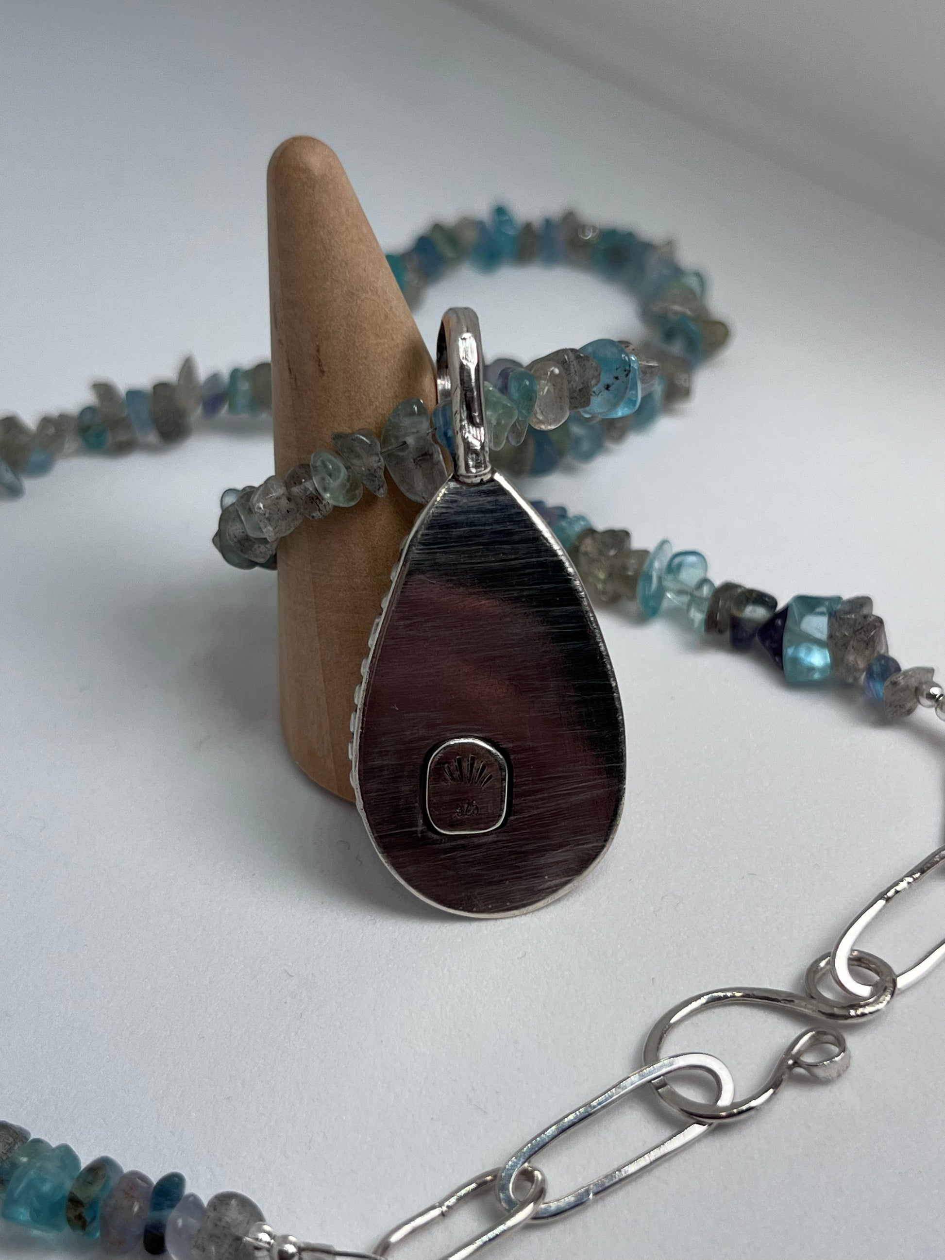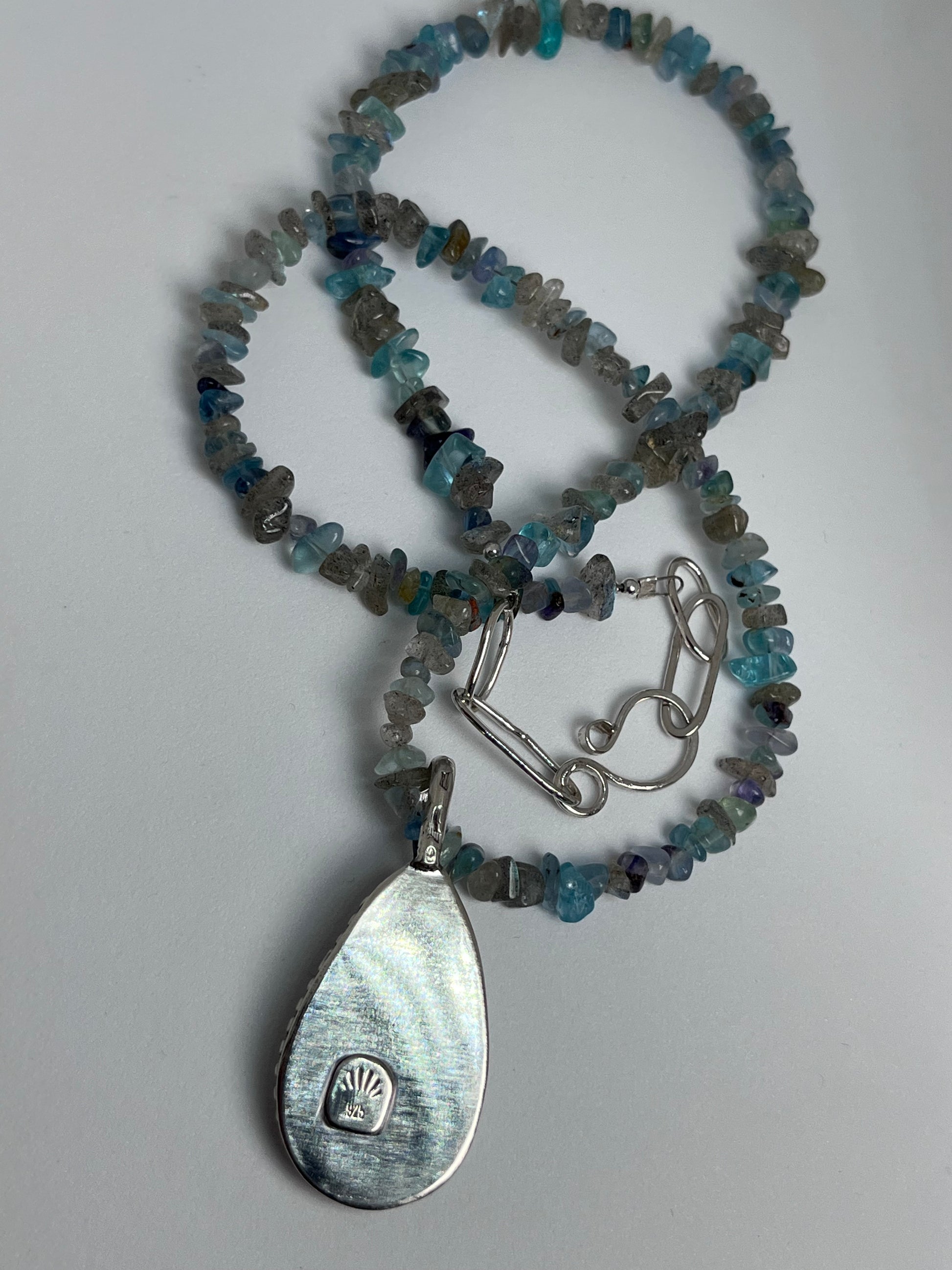 Handmade one of a kind necklace with Labradorite chips, Apatite chips, Fluorite chips and four sterling silver sphere beads, all strung on sturdy 7 strand beading wire. Featuring a lovely deep blue Labradorite stone pendant in a sterling silver serrated and diamond textured bezel and beaded band. The back has a soldered .925 stamp accent and hand forged bail.