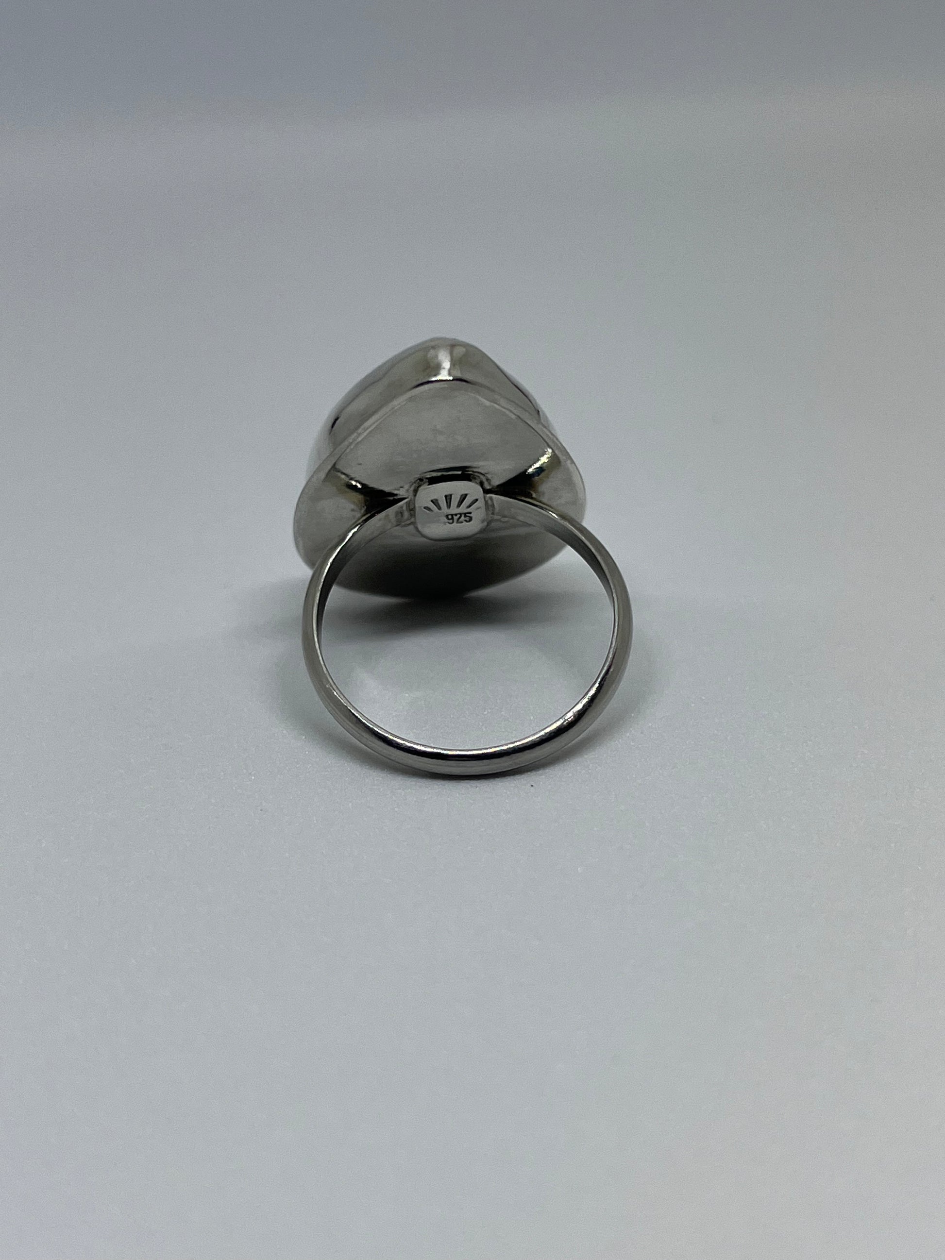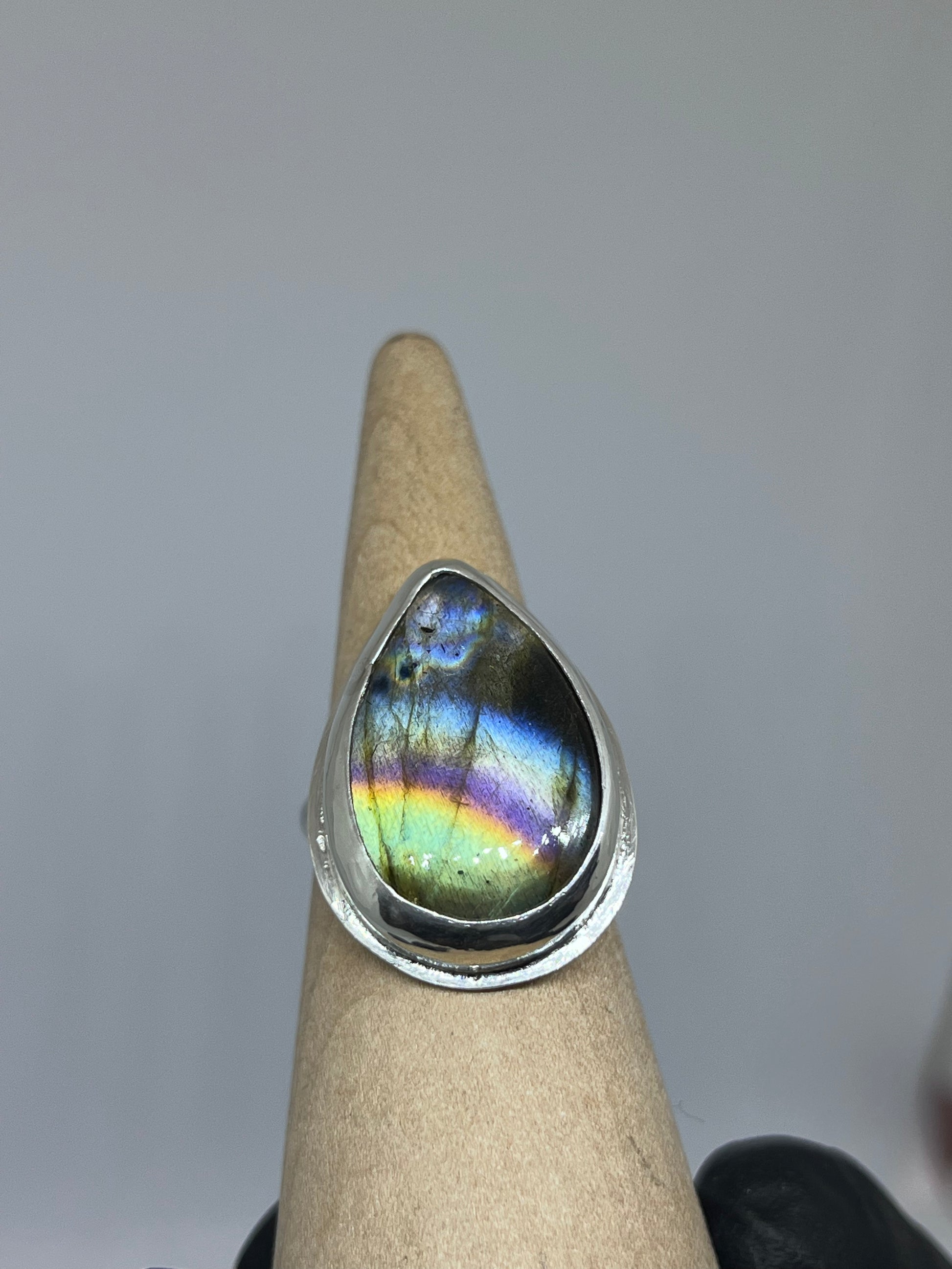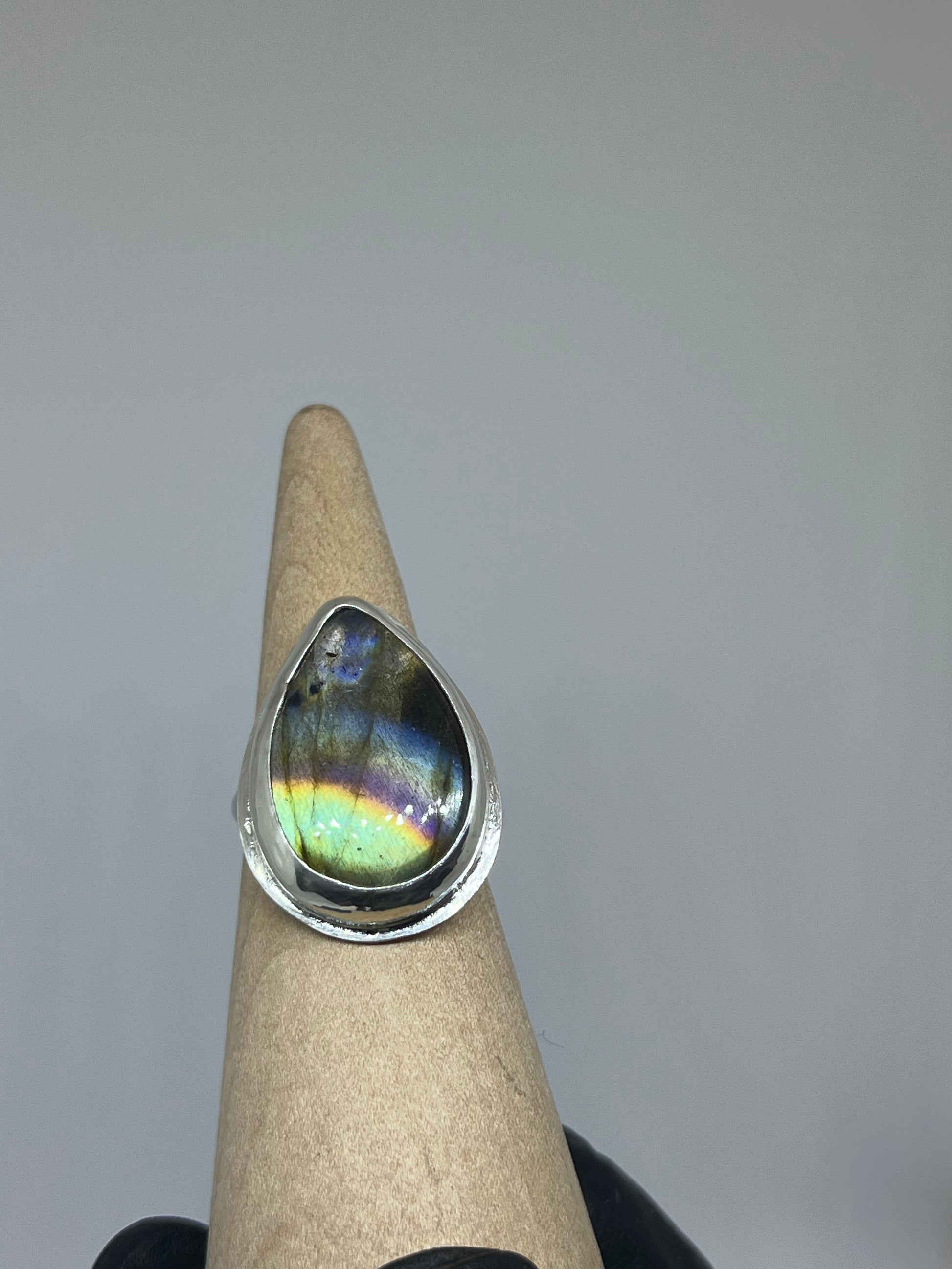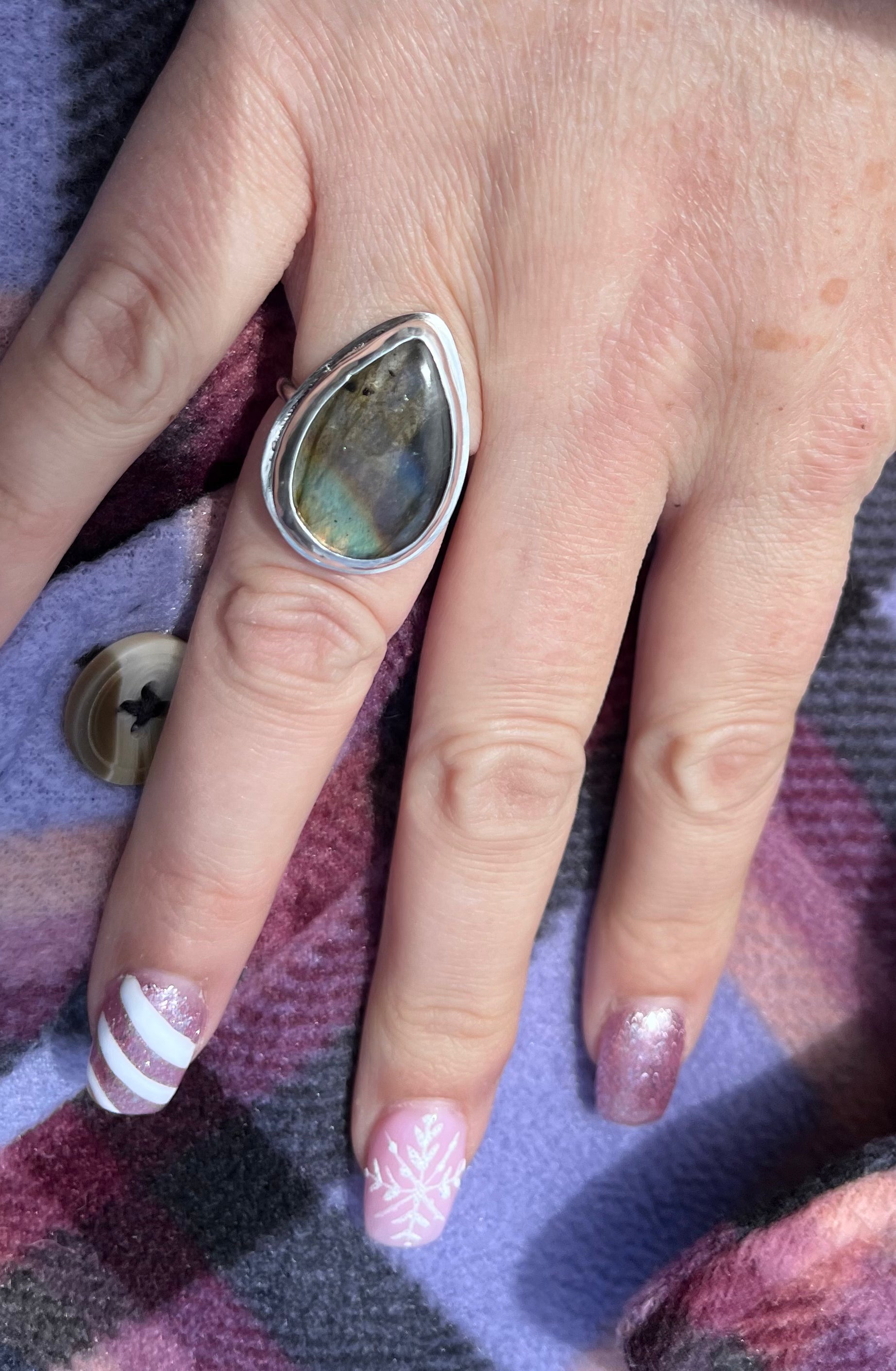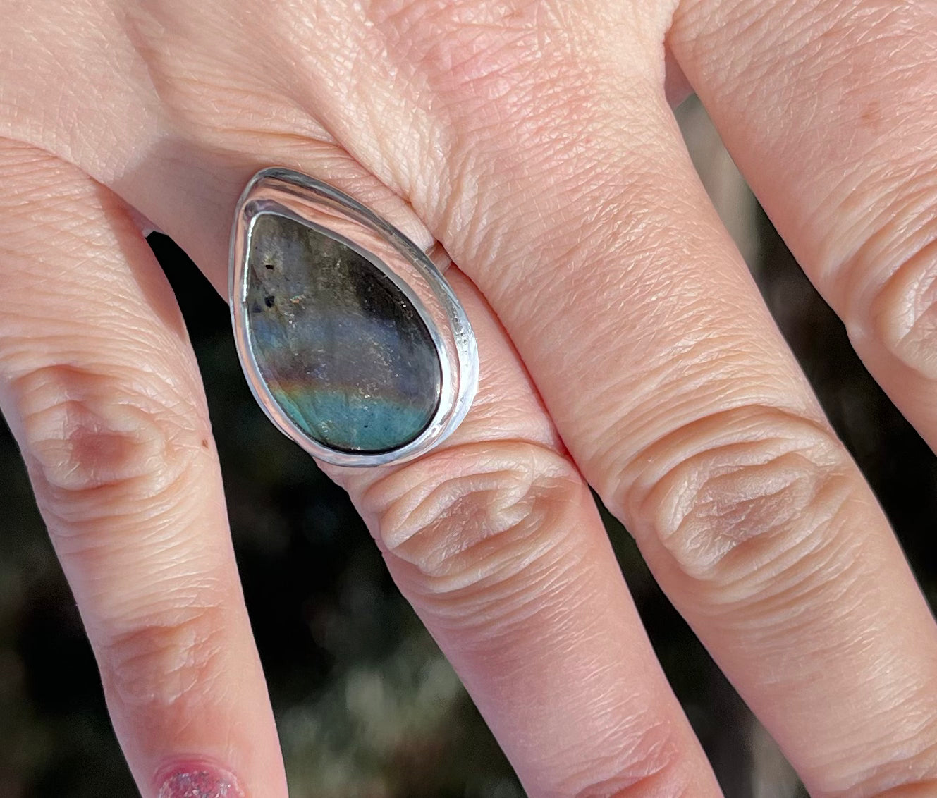 Aurora is a beautiful and simple, yet elegant, one of a kind ring of Labradorite. Set in a smooth sterling silver bezel with a smooth backplate and hand stamped soldered makers mark, on an 11 gauge band.