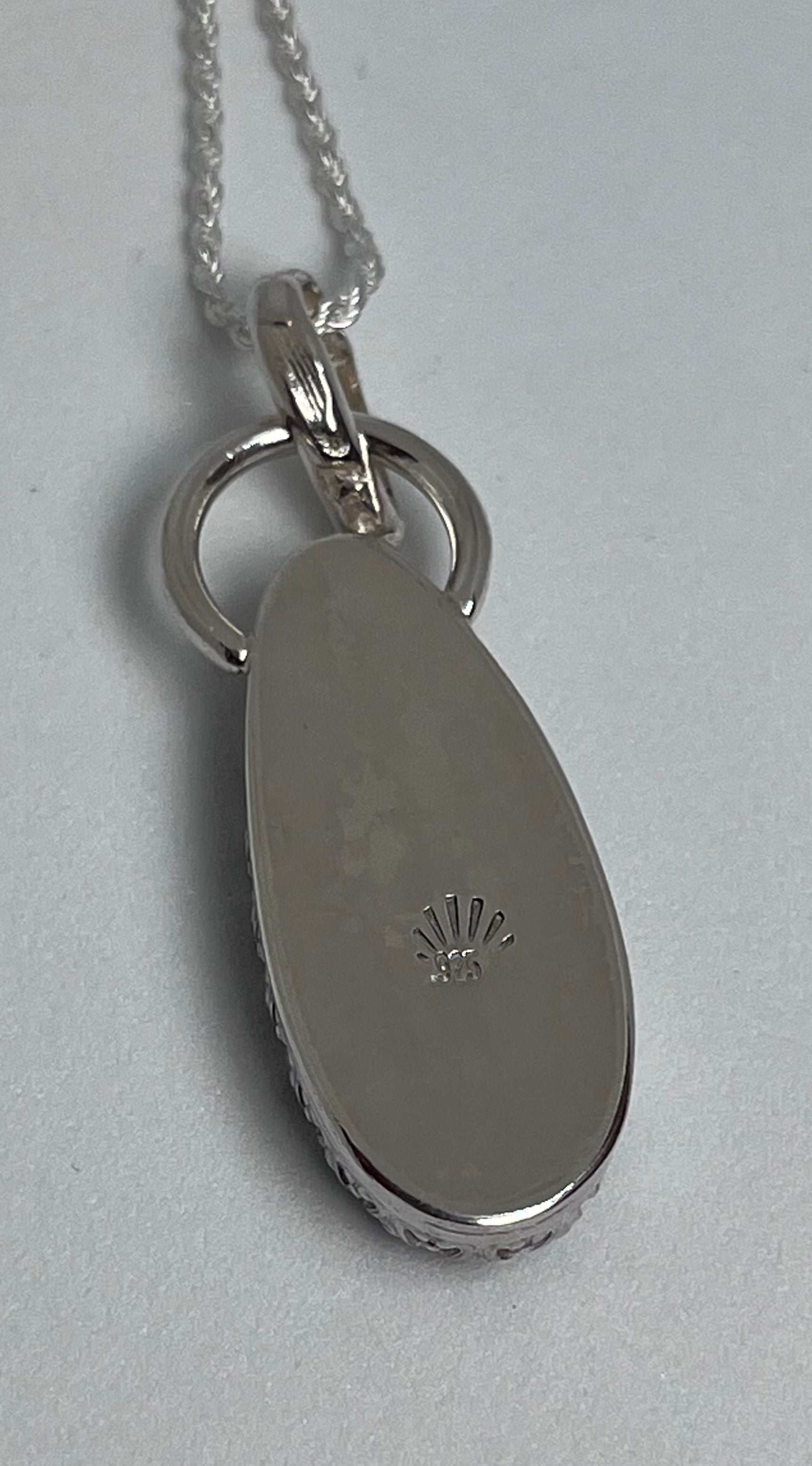 This beauty hangs on an Italian made, 16 in sterling silver 1.2 mm chain with a lobster claw clasp.