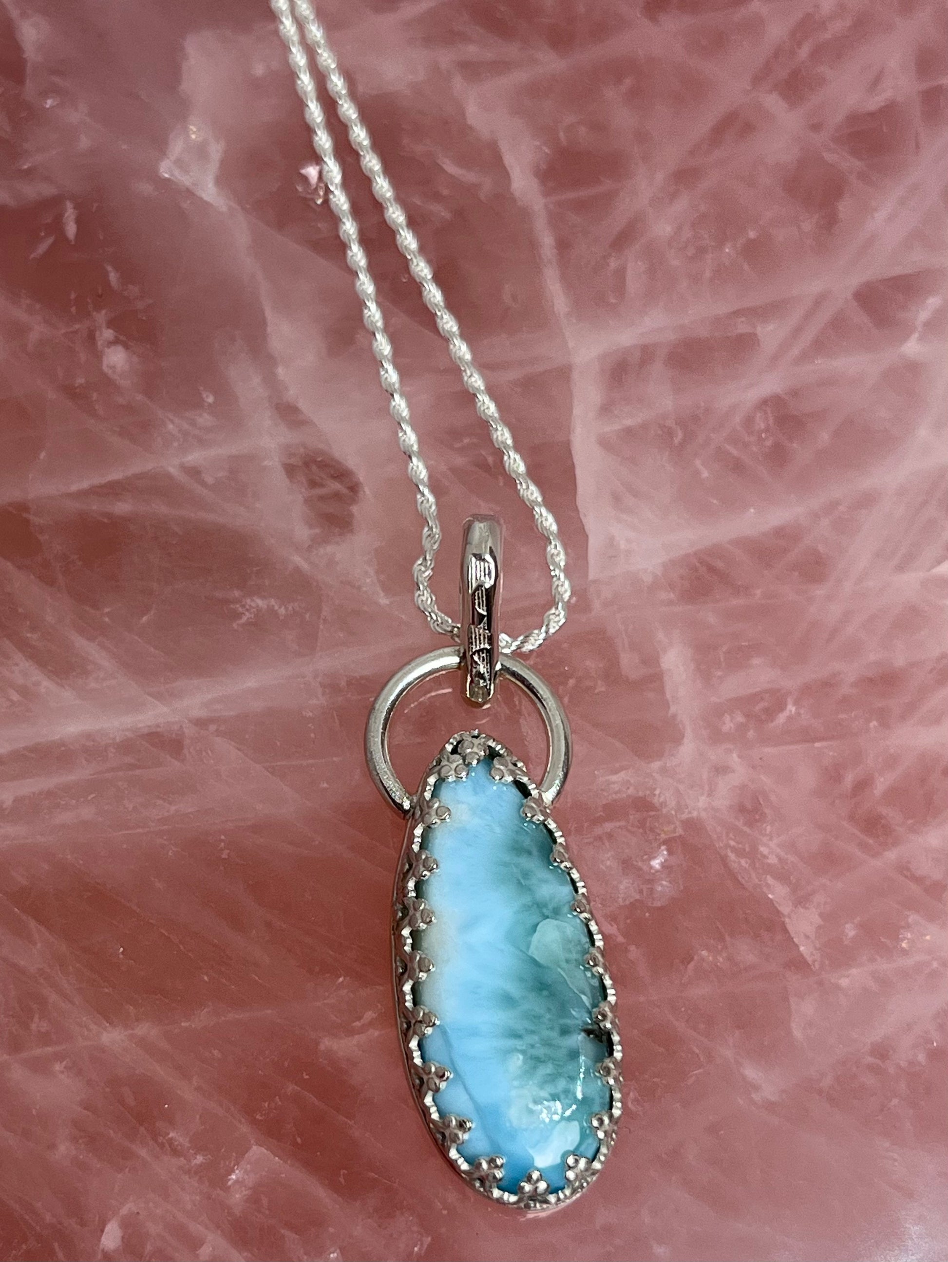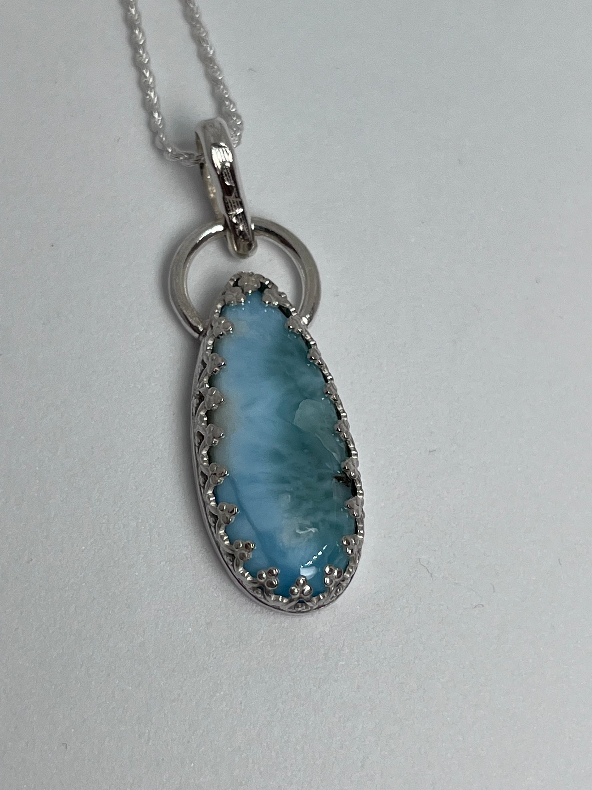 Handcrafted one of a kind Larimar pendant set in a sterling silver crown bezel with a smooth backplate and hand stamped makers mark.