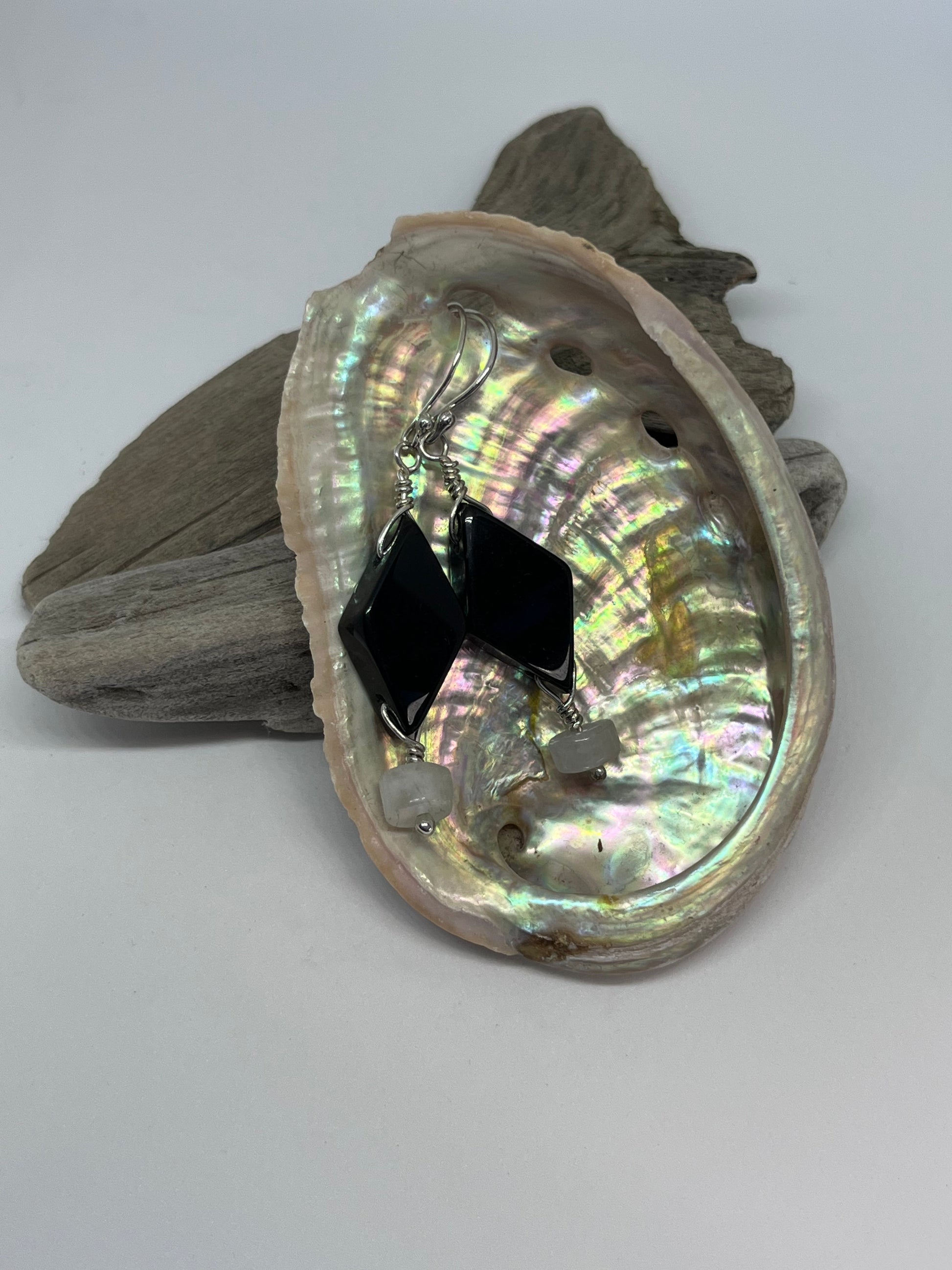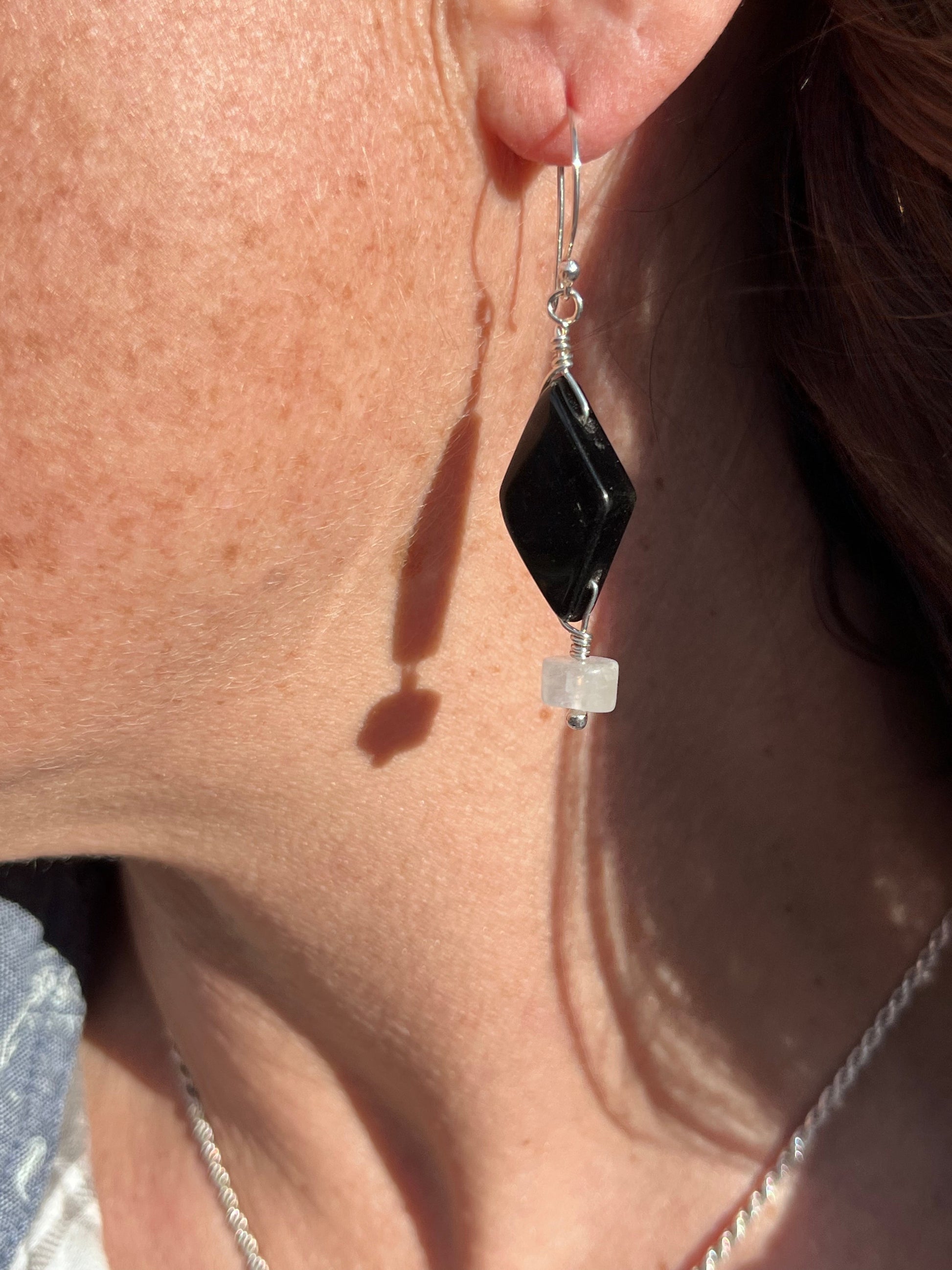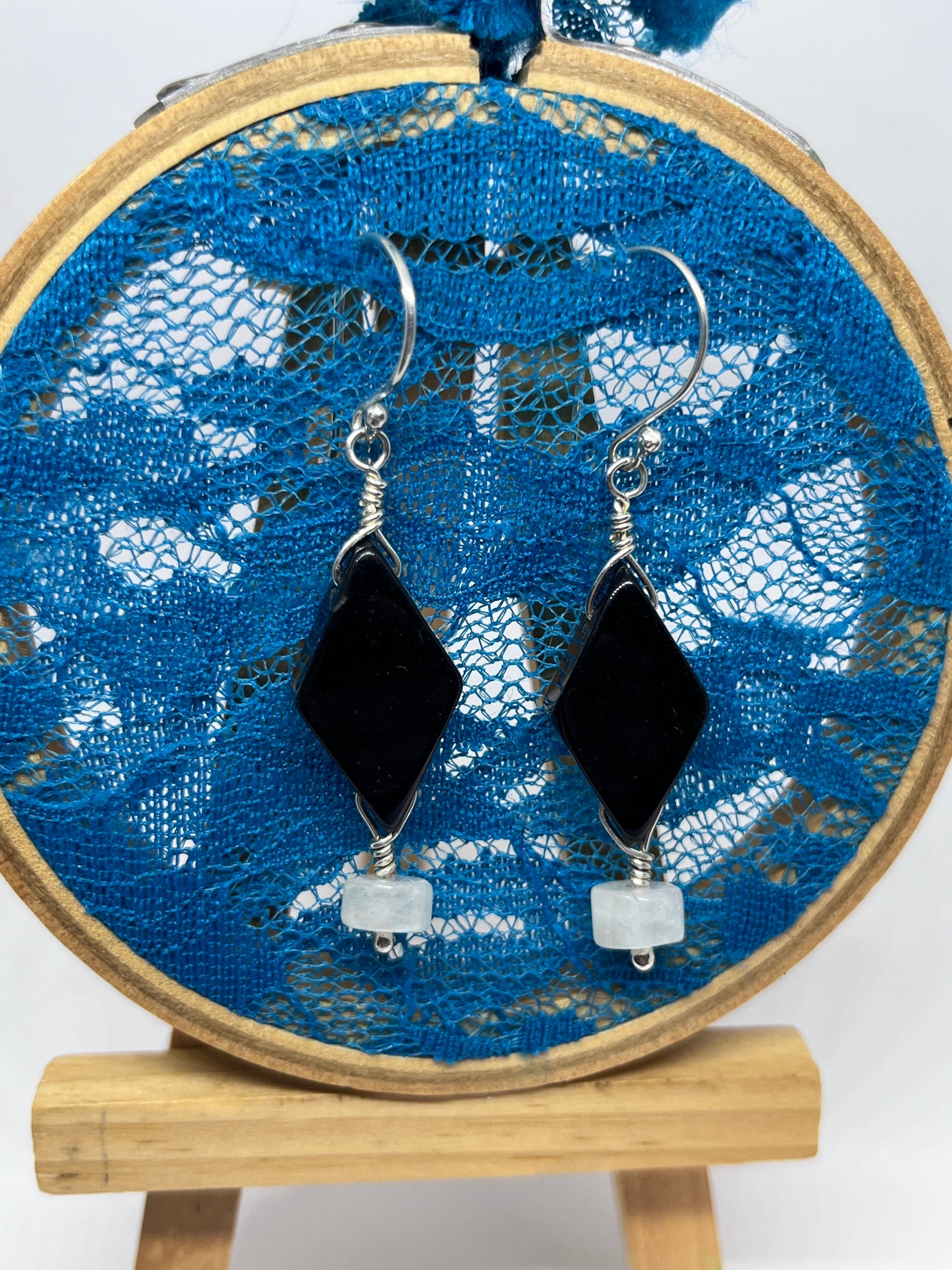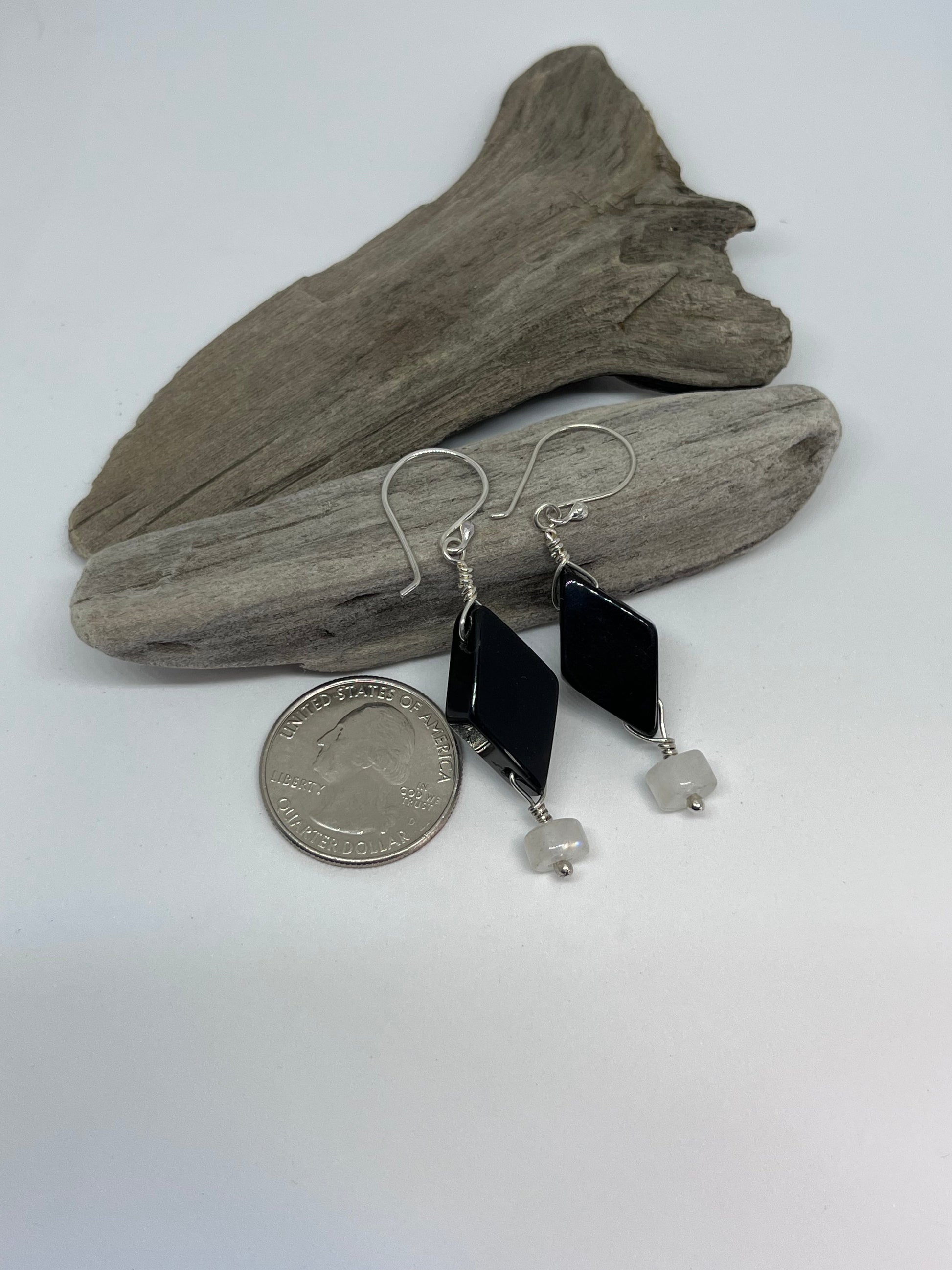 Diamond shaped Black Onyx stone earrings wire wrapped with sterling silver and dangling Moonstone cylinder shaped stones. These are paired with hand forged 20 gauge sterling silver wire ear hooks. These beautiful stones were gifted to me and they have been given new life for you to love.