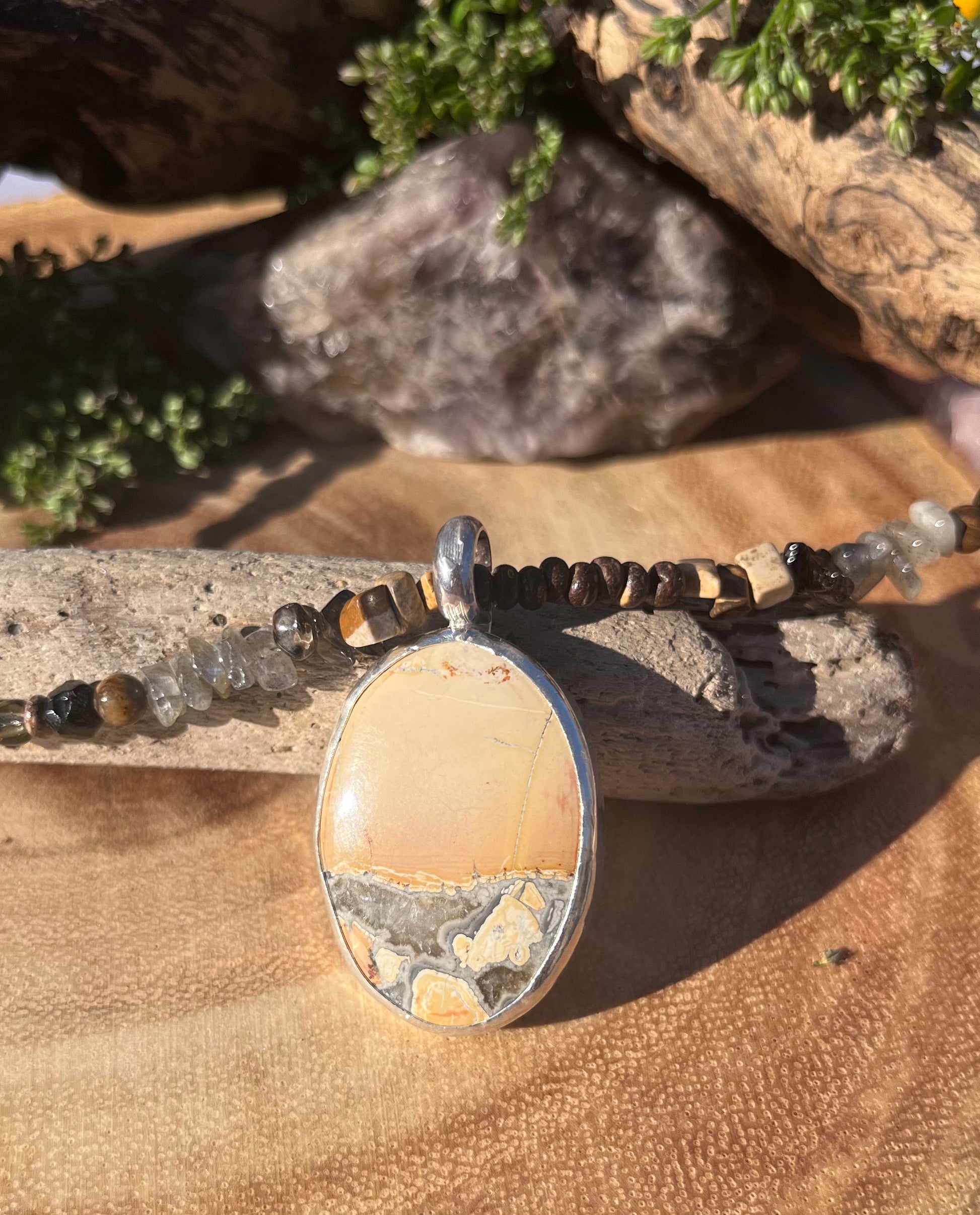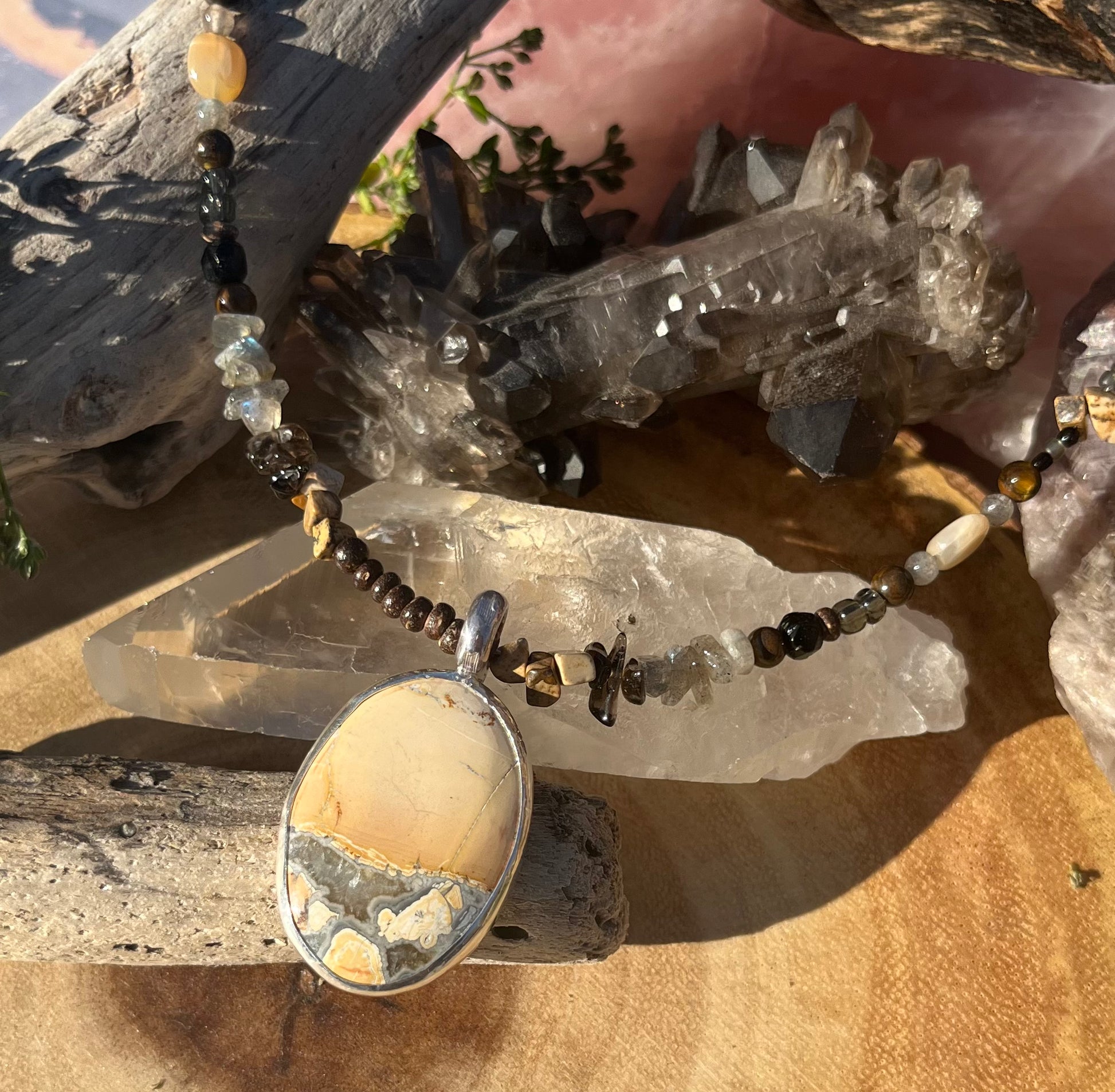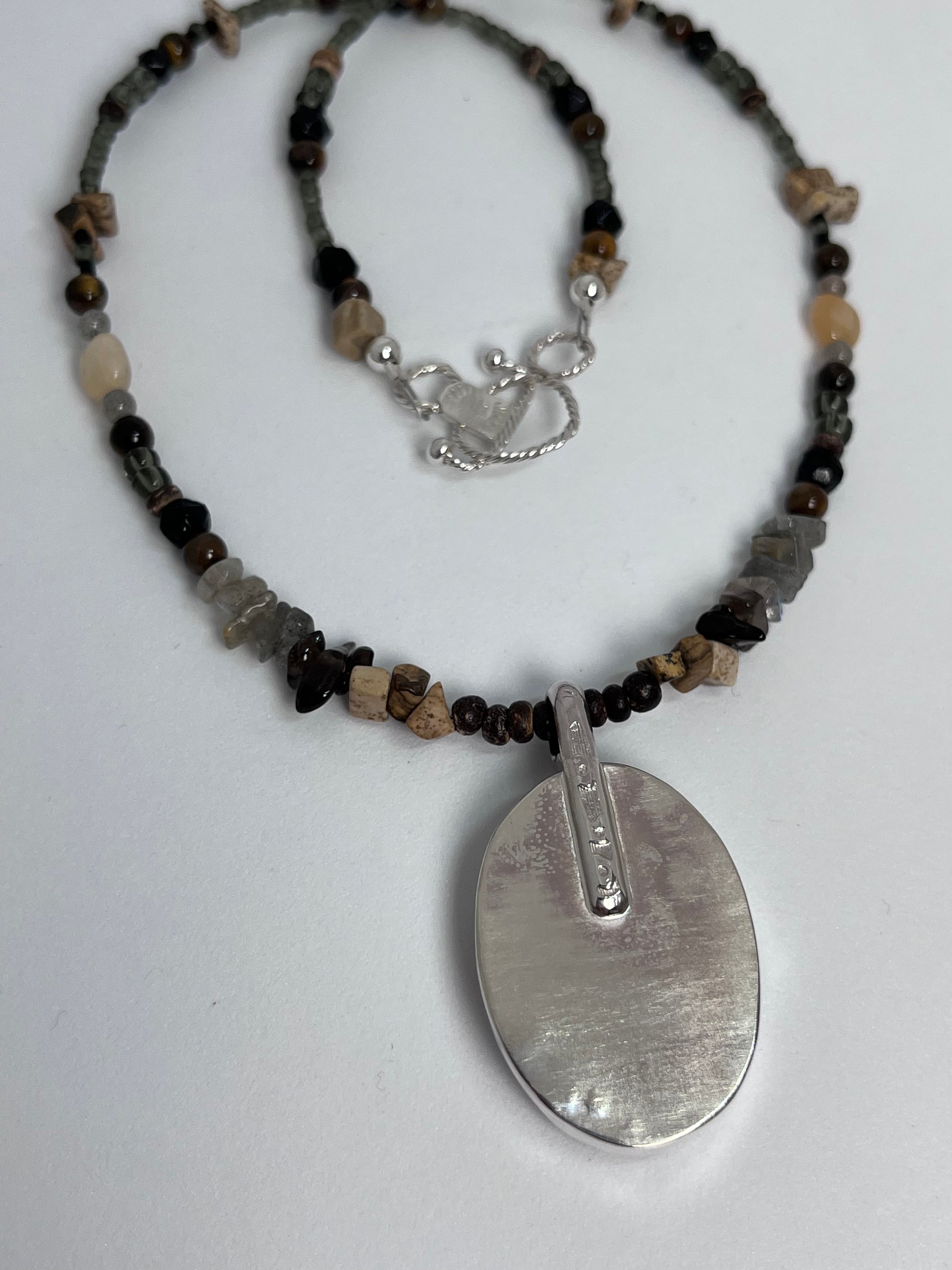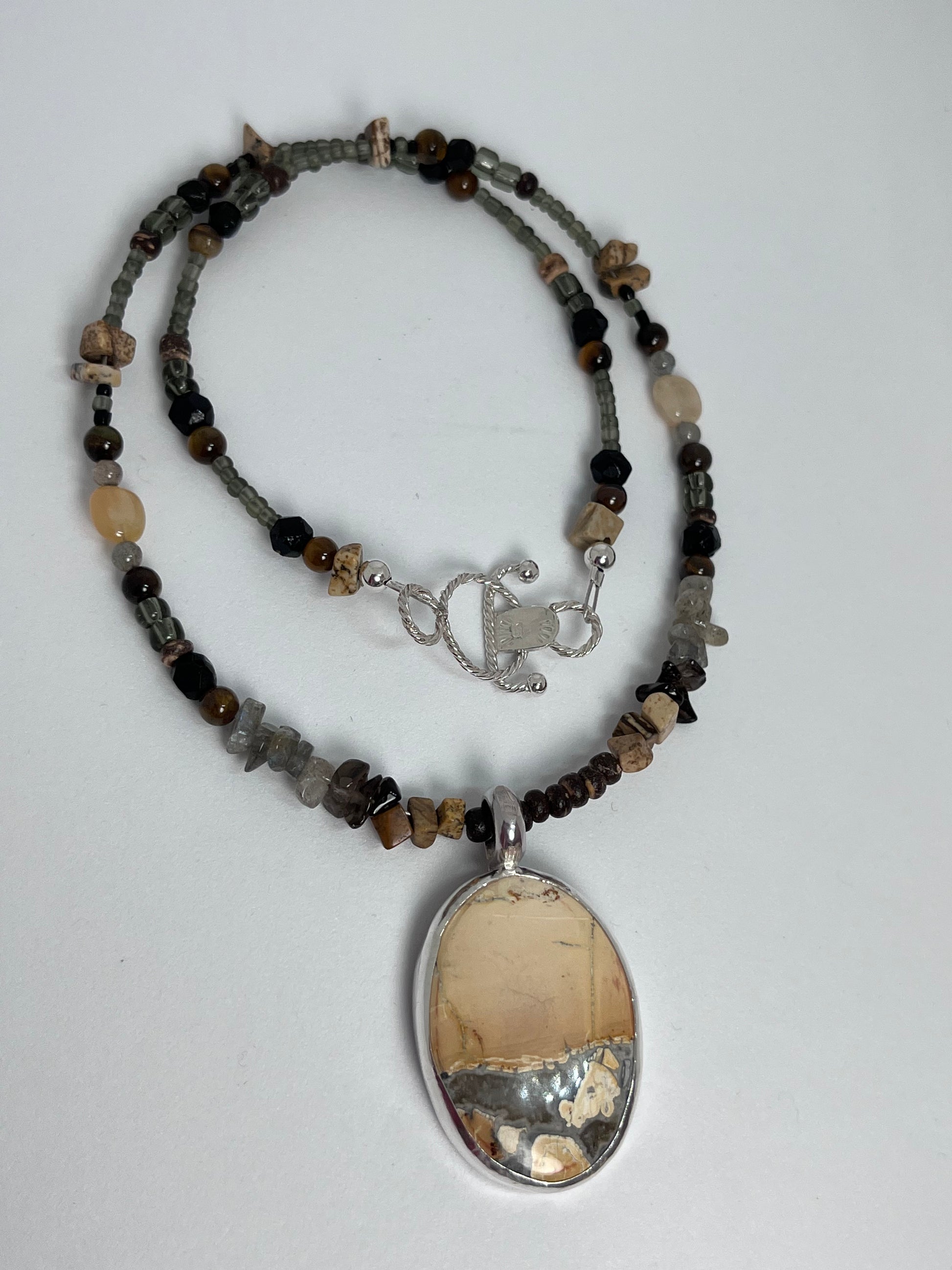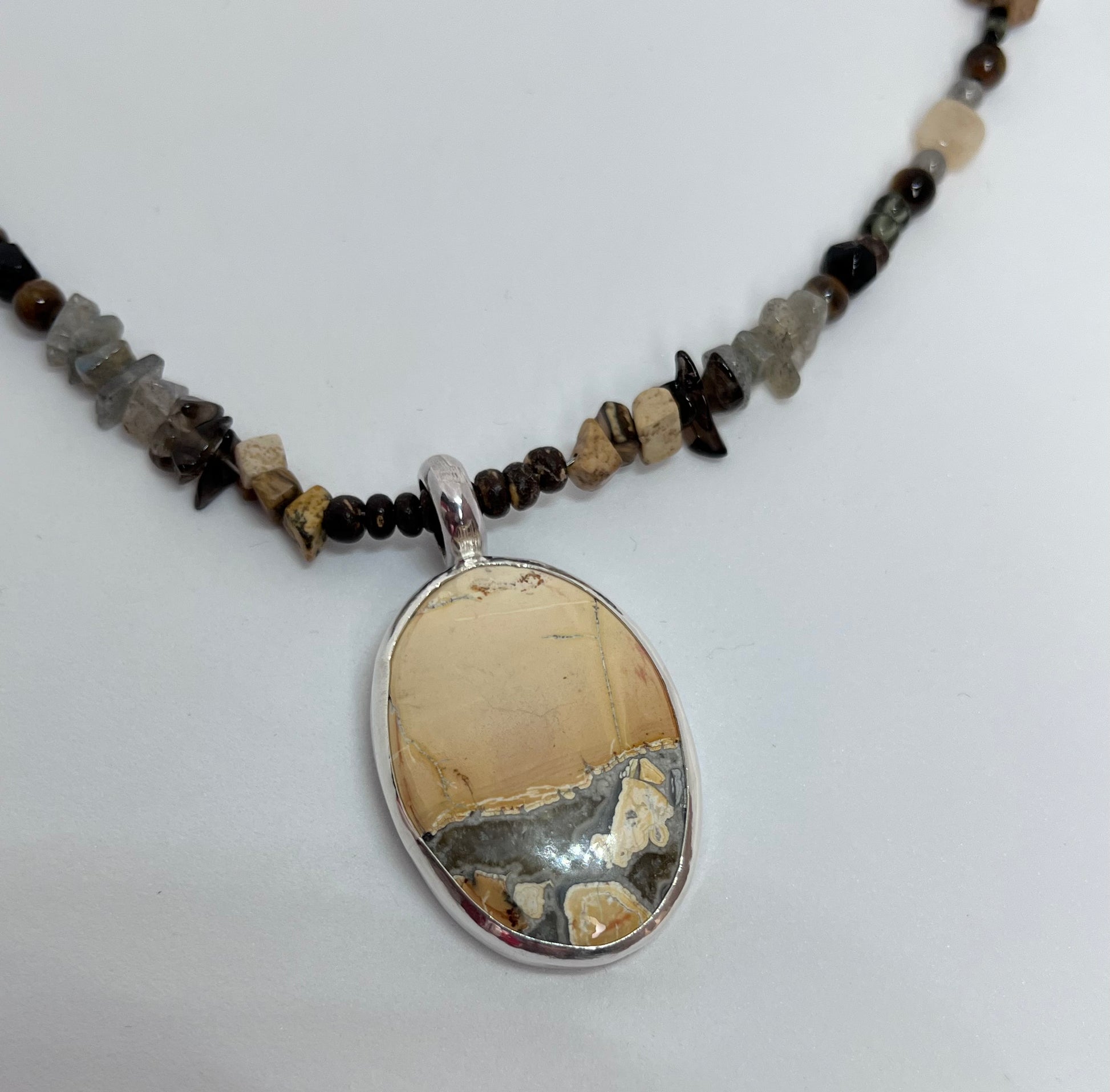 Handmade one of a kind necklace with Picture Jasper chips, Smokey Quartz chips, Labradorite chips and spheres, Tiger Eye spheres, and Peach Moonstone nuggets, and up cycled wood beads. All strung together on durable 9 strand bead stringing wire with a hand forged sterling silver twisted rope clasp, accented with hand stamped makers mark and featuring a beautiful handmade sterling silver pendant with a smooth bezel and hand forge bail and a large Picture Jasper stone.