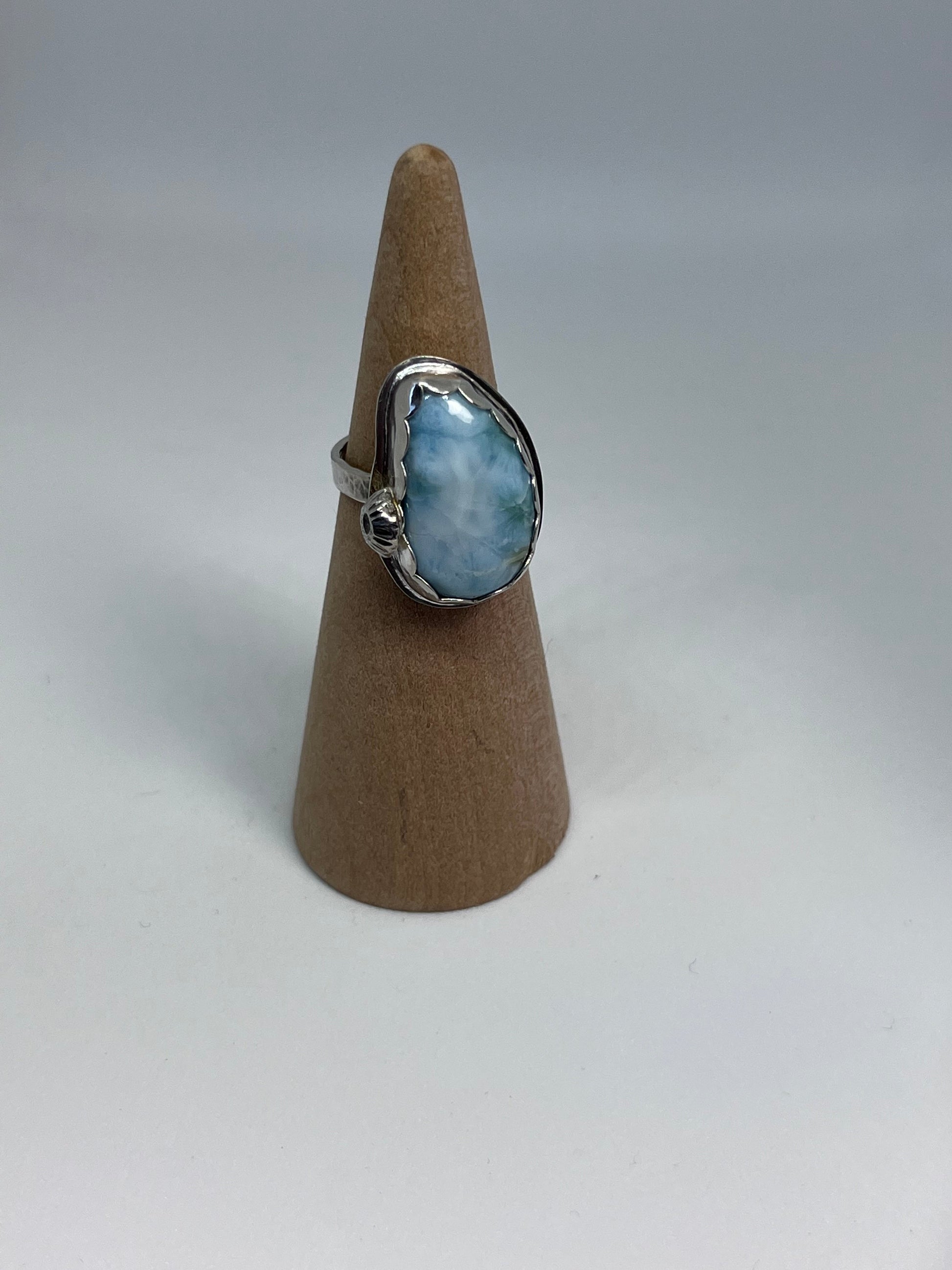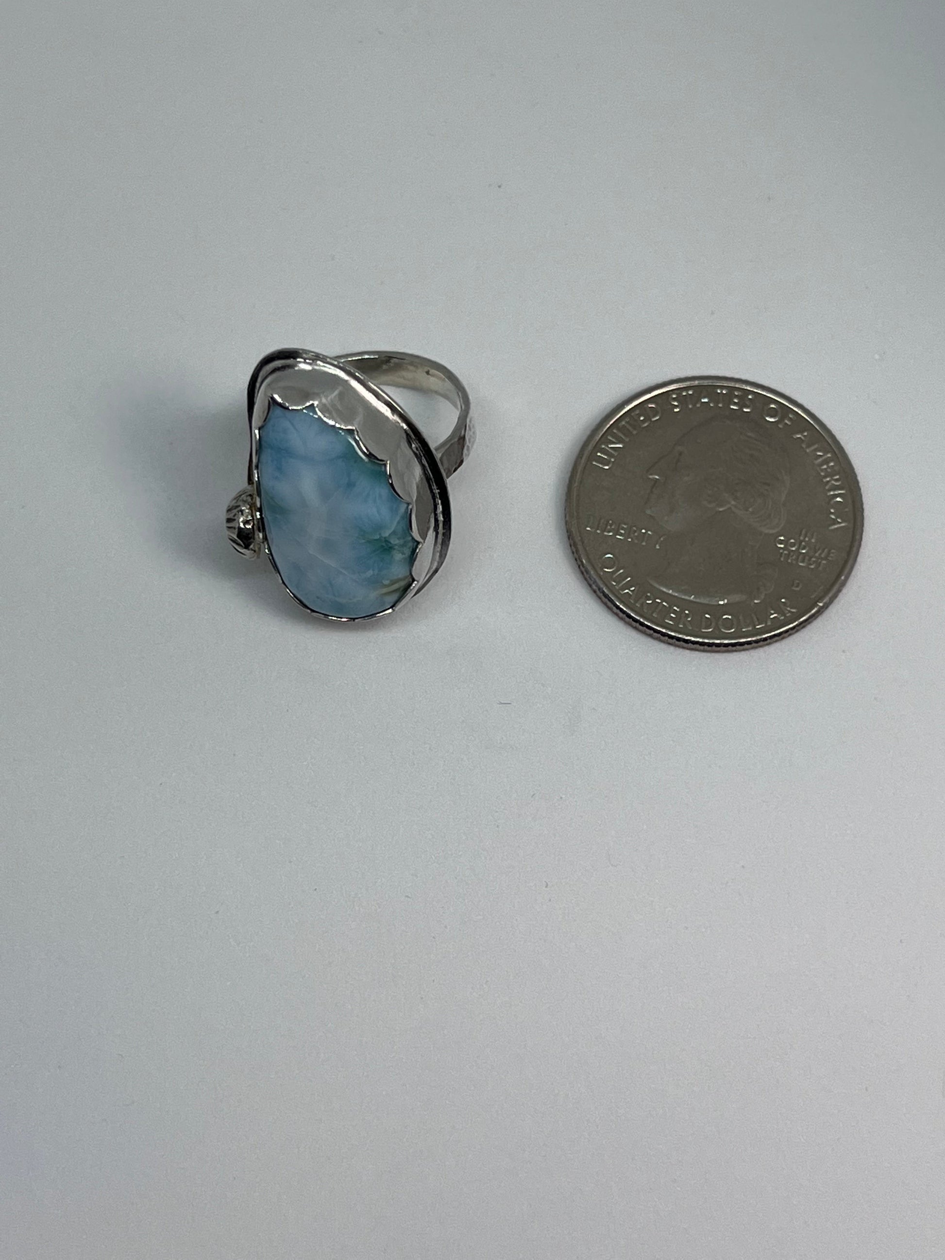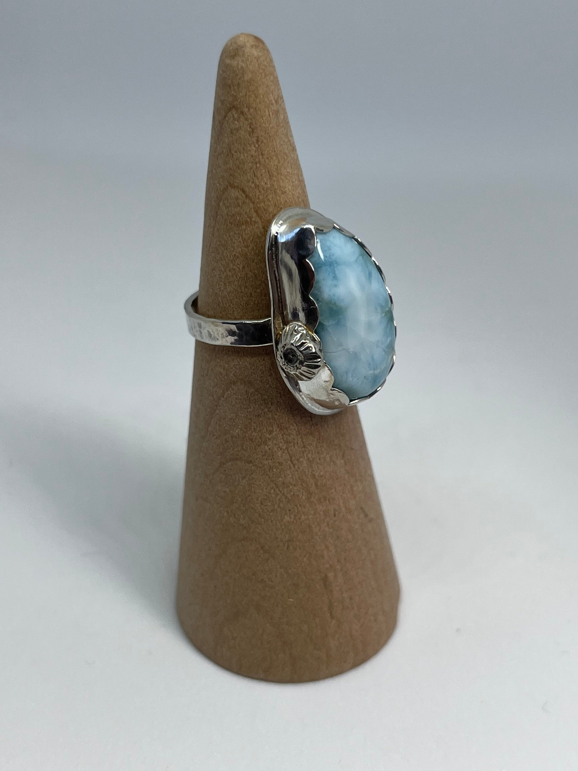 Simply Christine, because she is simply beautiful. This lovely Larimar ring is set in a smooth sterling silver scallop bezel and accented with a recycled silver embellishment. Sitting on a hand forged hammered band, and hand stamped makers mark in the back. Both band and mark are highlighted with patina to enhance the hammer mark details.