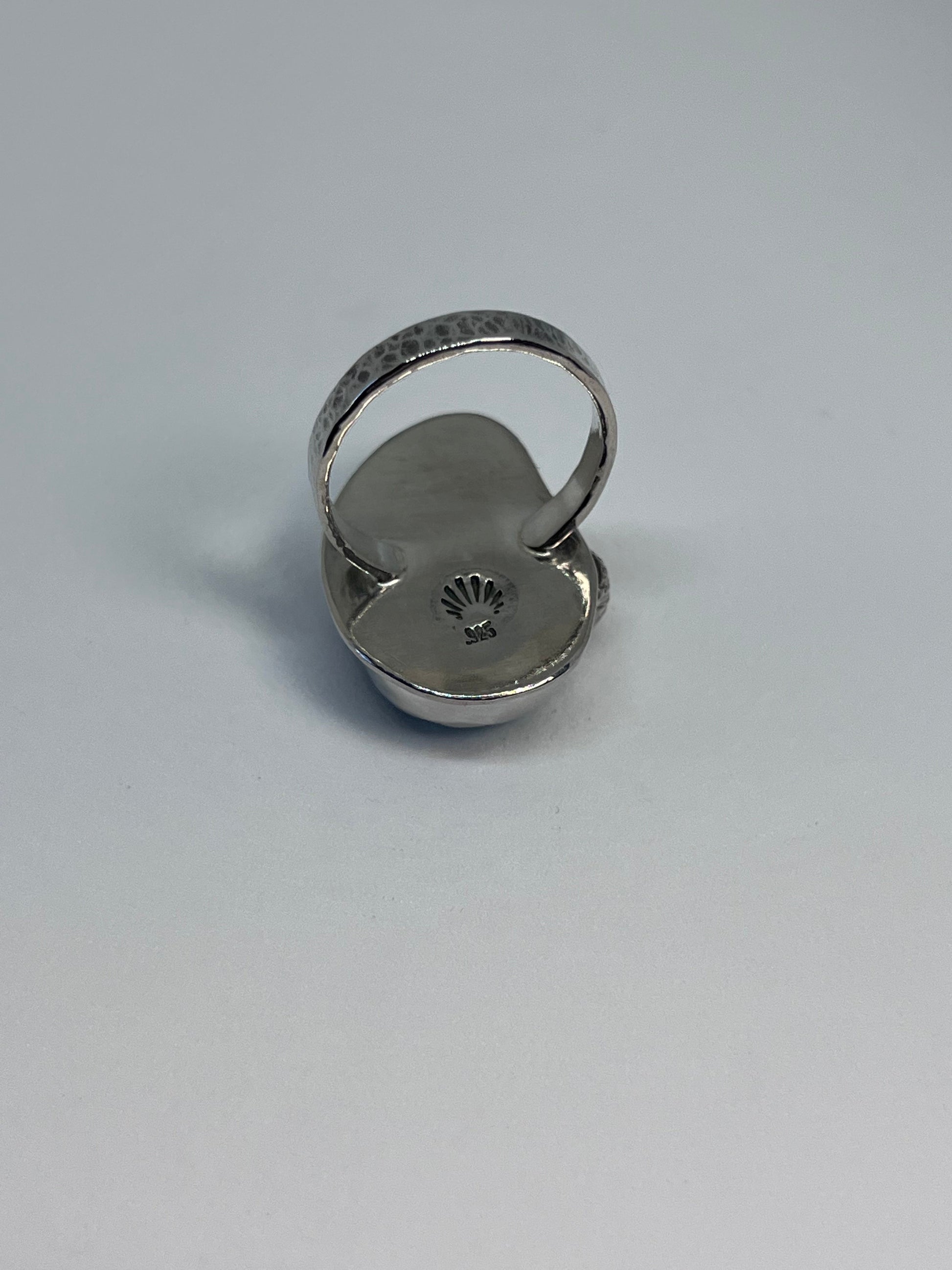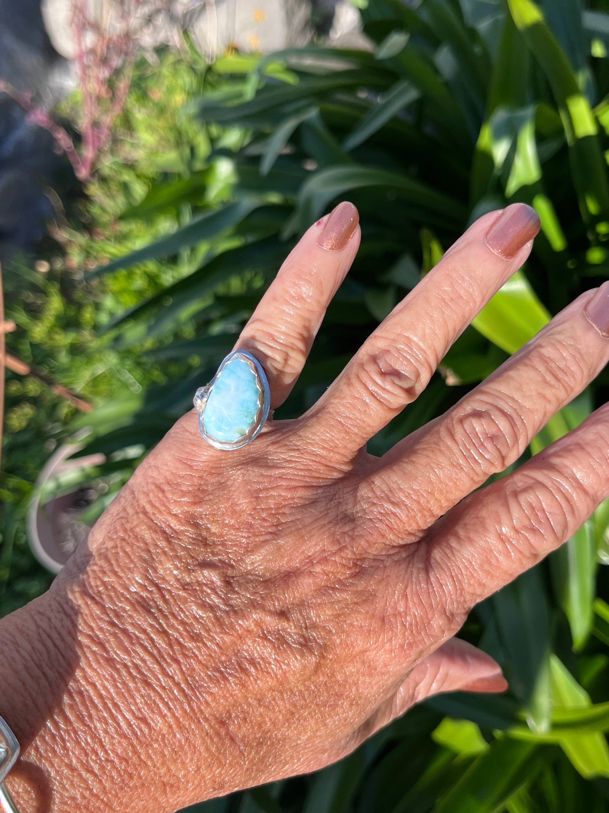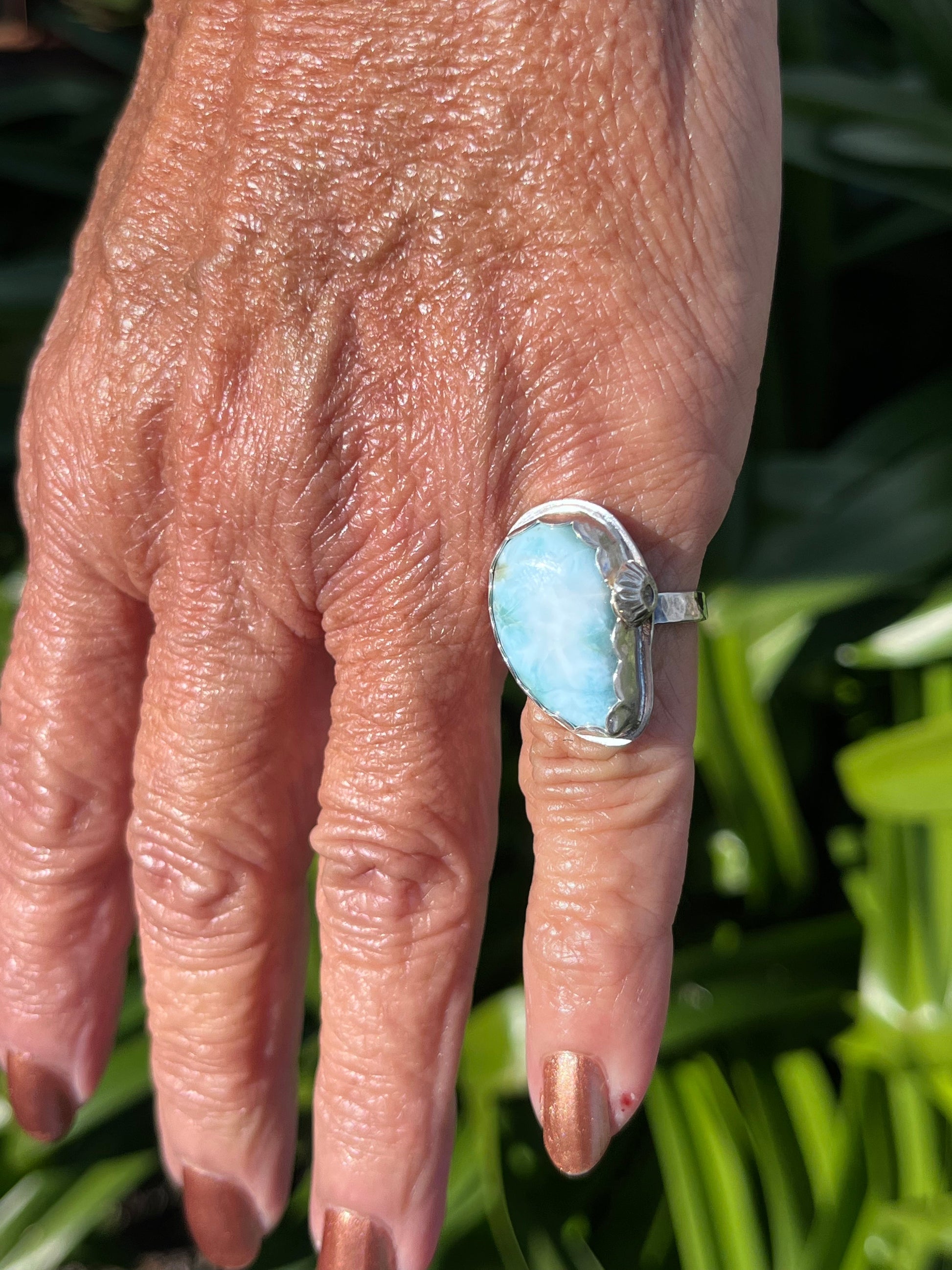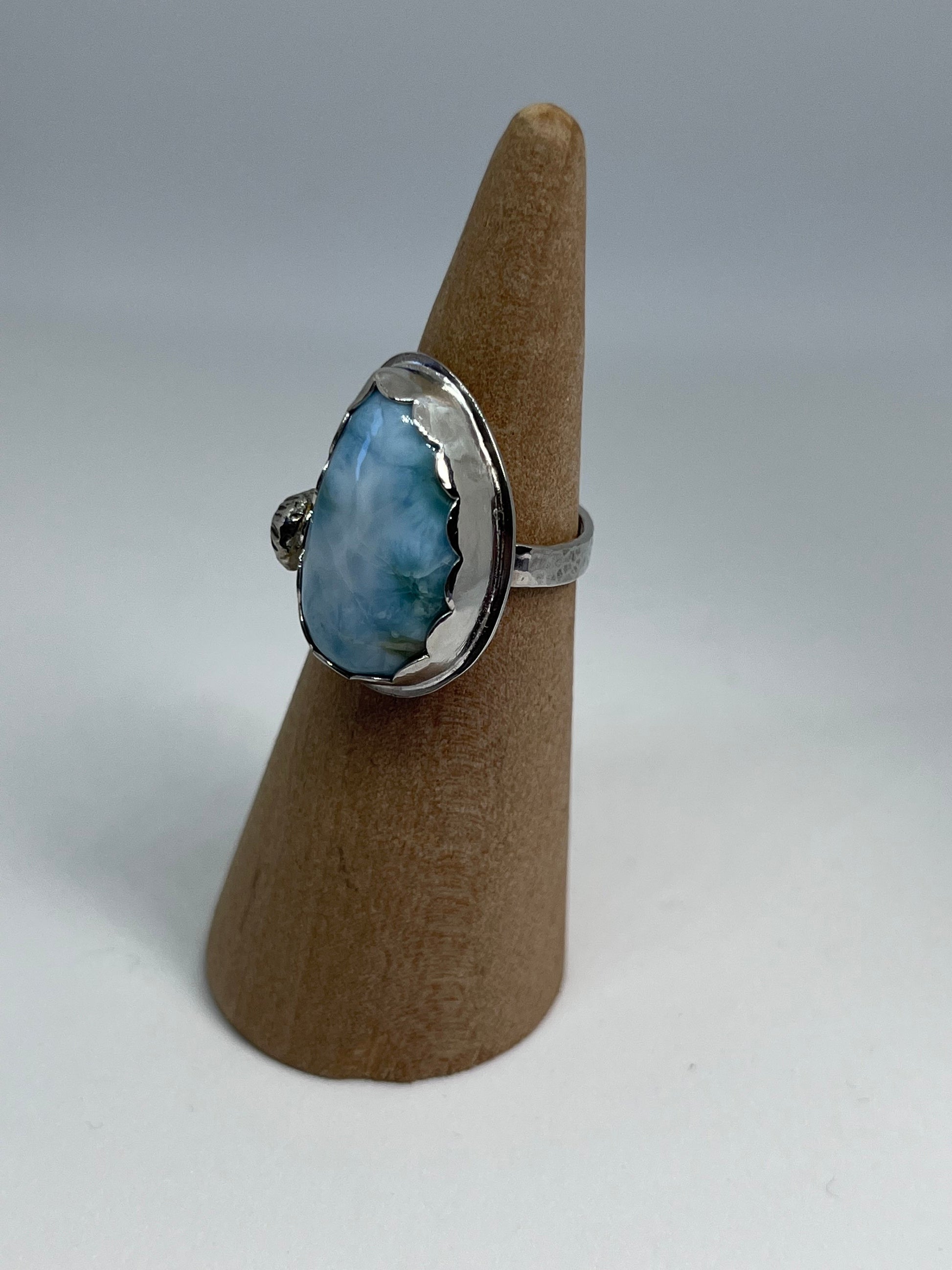 Simply Christine, because she is simply beautiful. This lovely Larimar ring is set in a smooth sterling silver scallop bezel and accented with a recycled silver embellishment. Sitting on a hand forged hammered band, and hand stamped makers mark in the back. Both band and mark are highlighted with patina to enhance the hammer mark details.