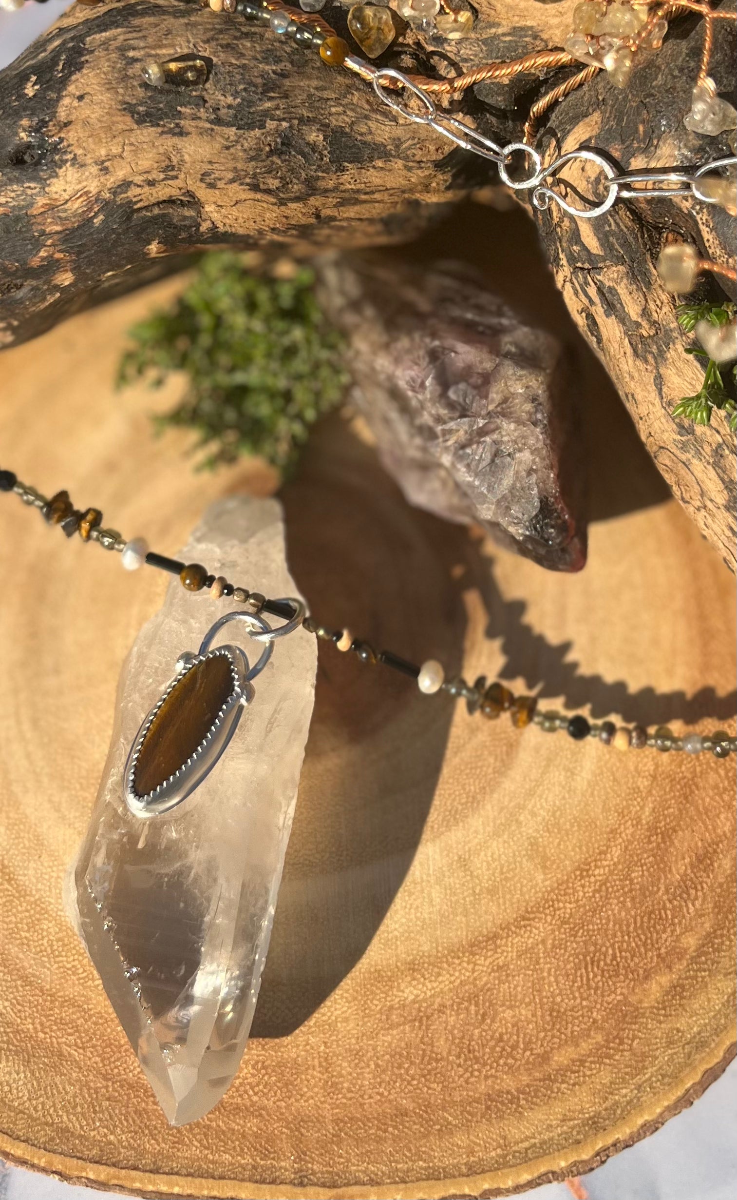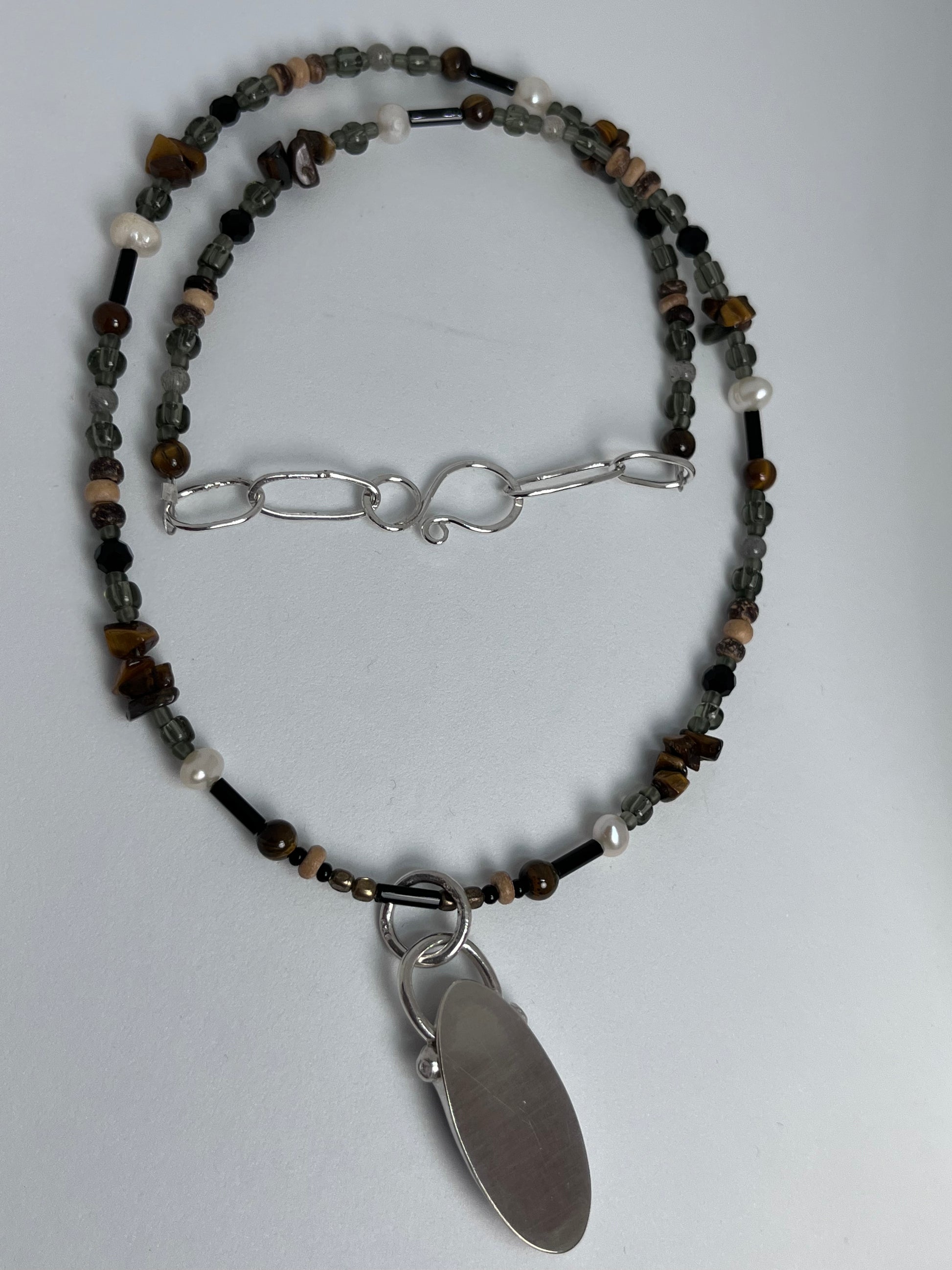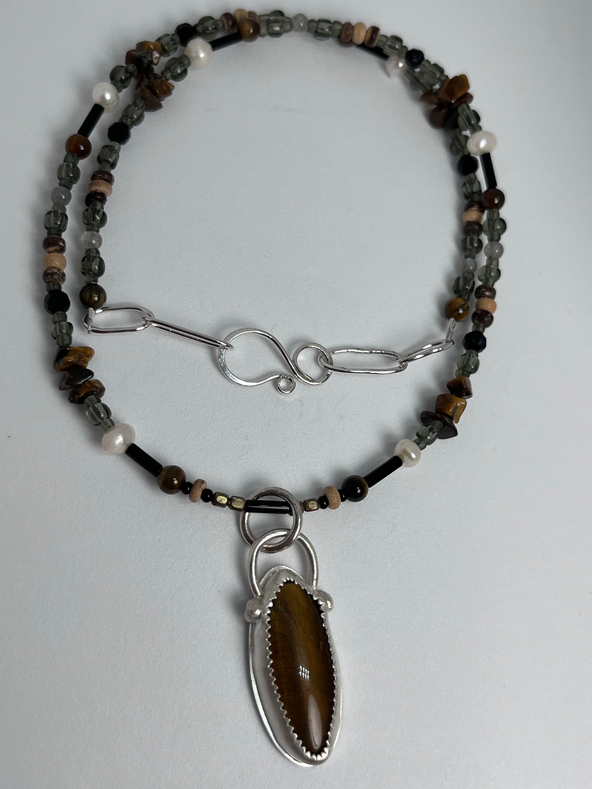 Handmade one of a kind necklace with Tiger Eye spheres and chips, Mother of Pearl rice chips, Labradorite spheres, up cycled wood beads and seed beads.
