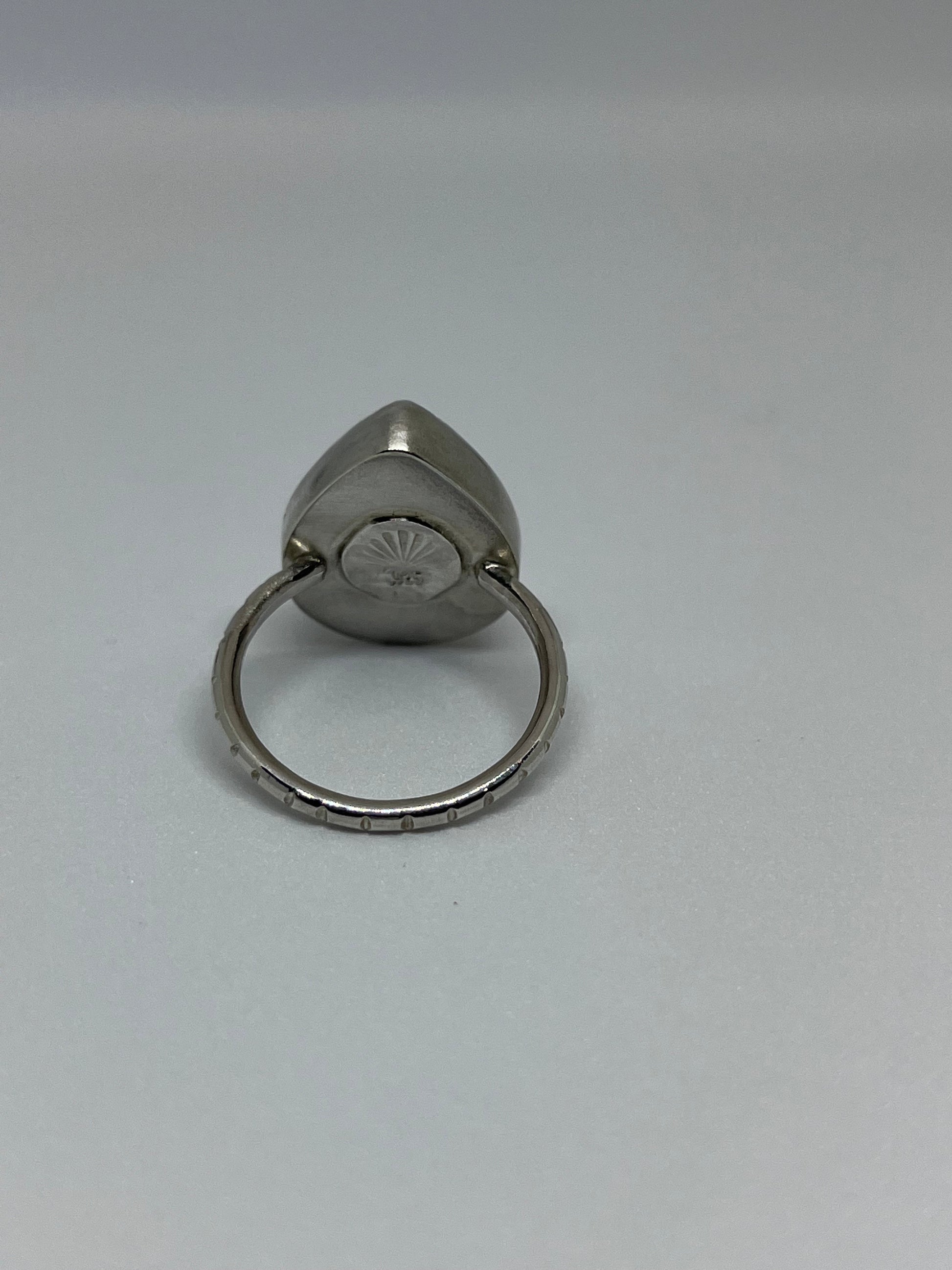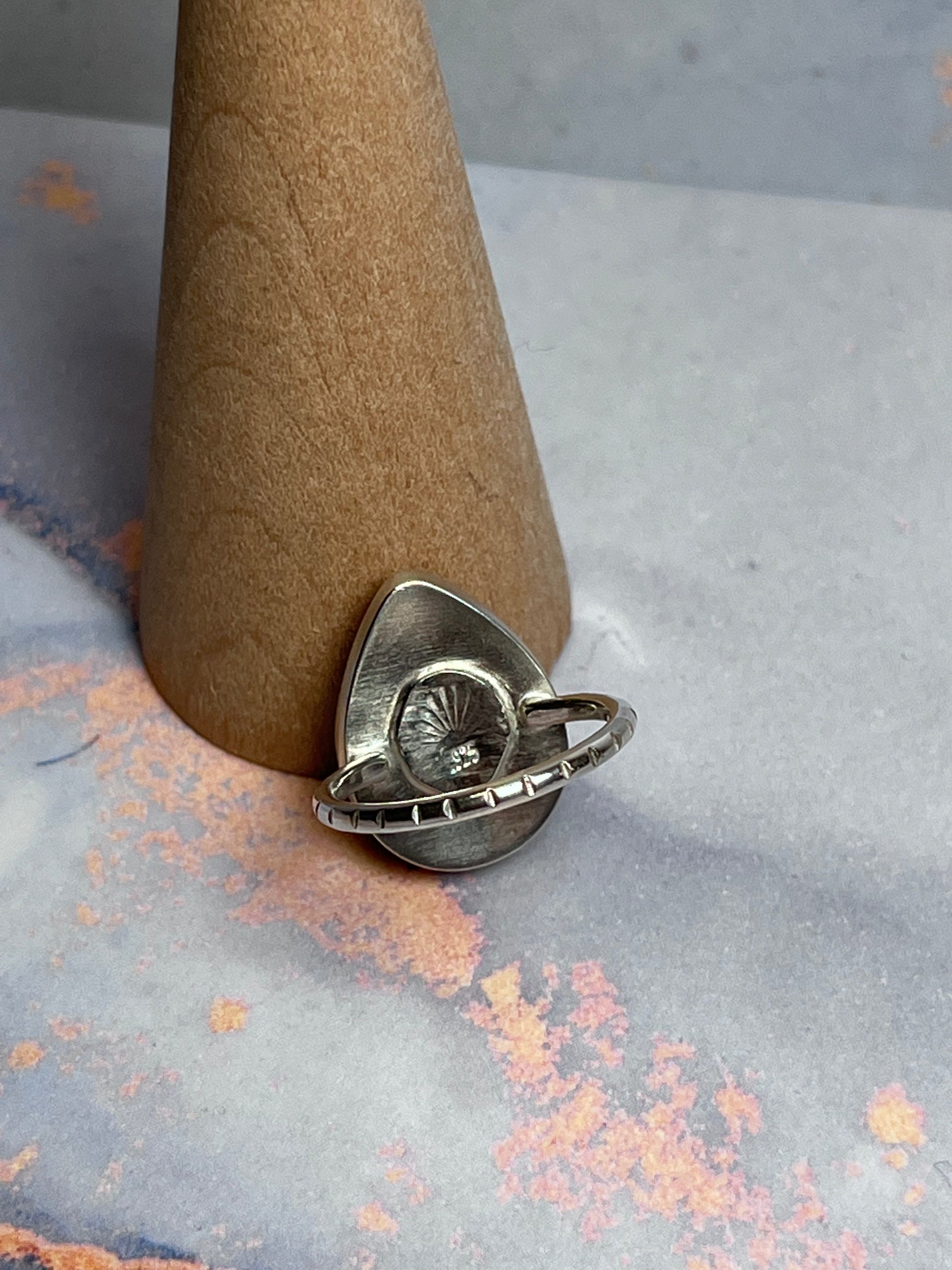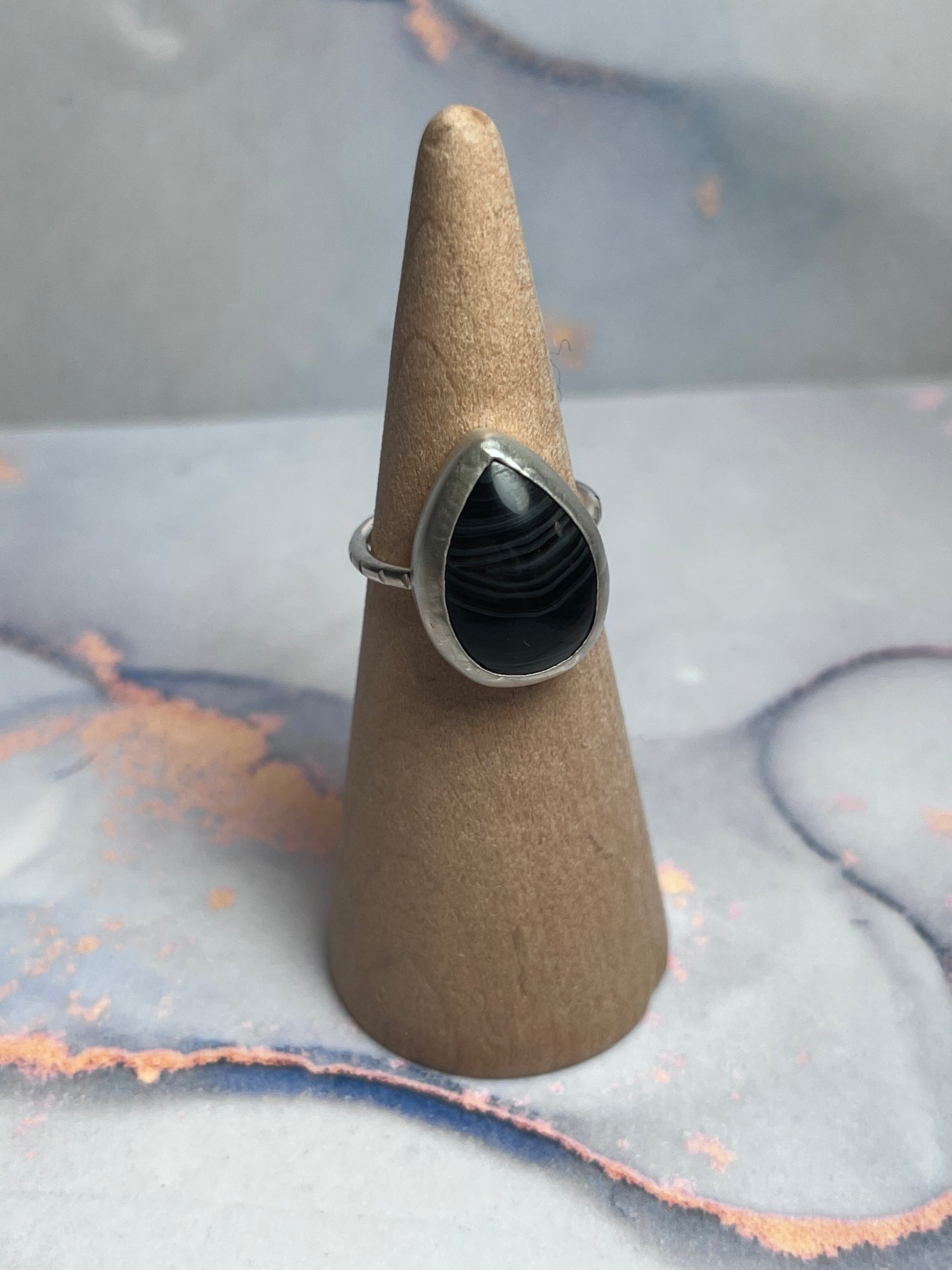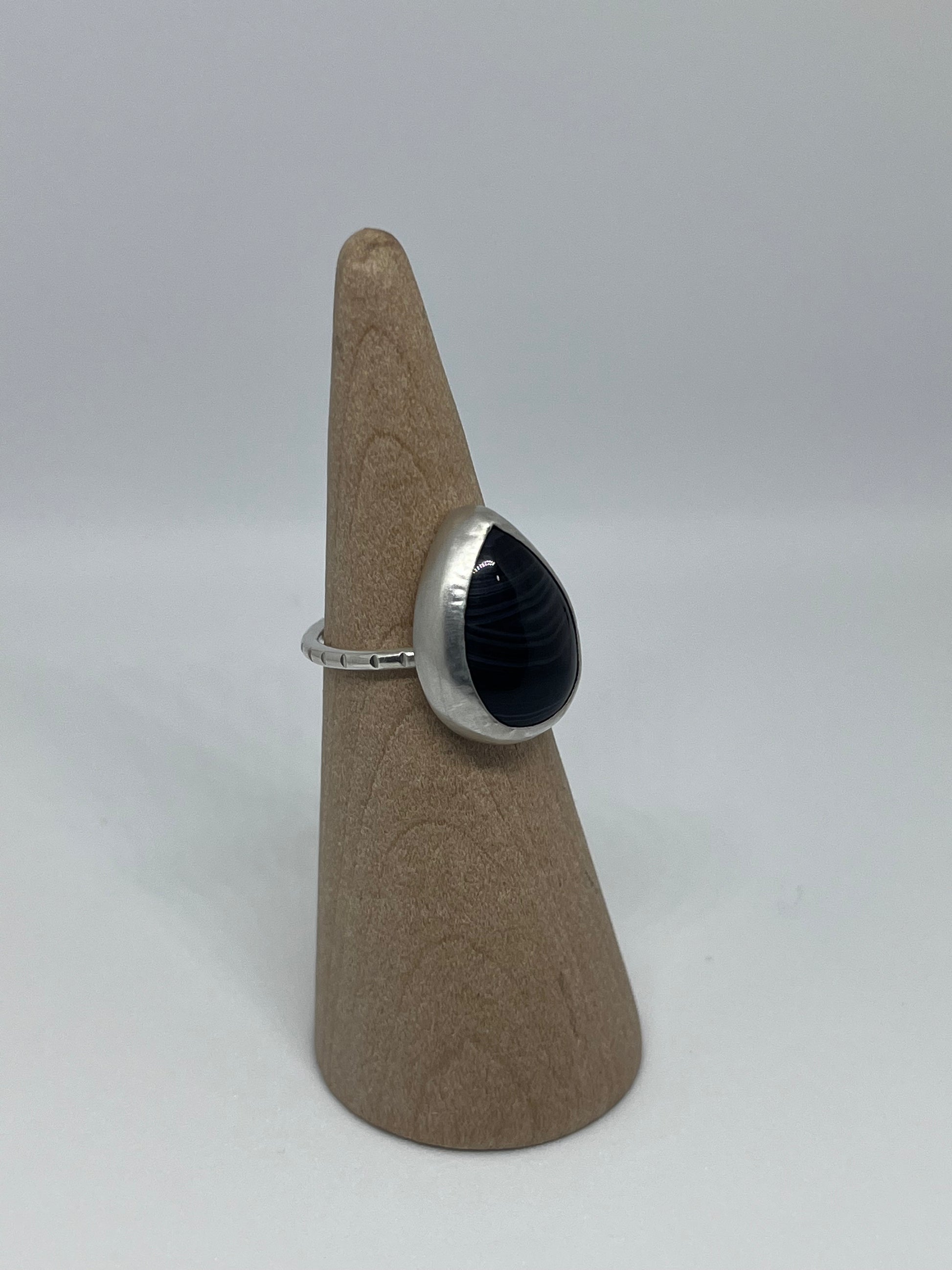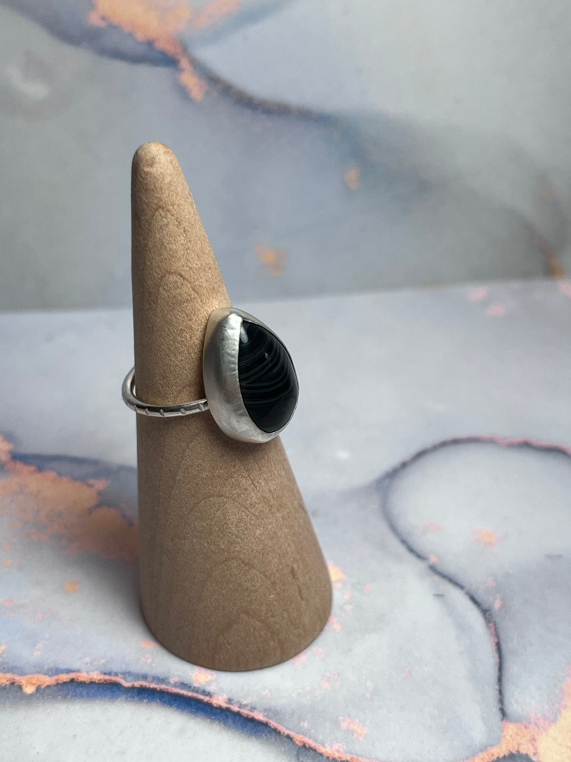 The Lil Banded Black Onyx, small but mighty with a hand stamped round band and a smooth satin bezel. A soldered makers mark gently kisses the back.