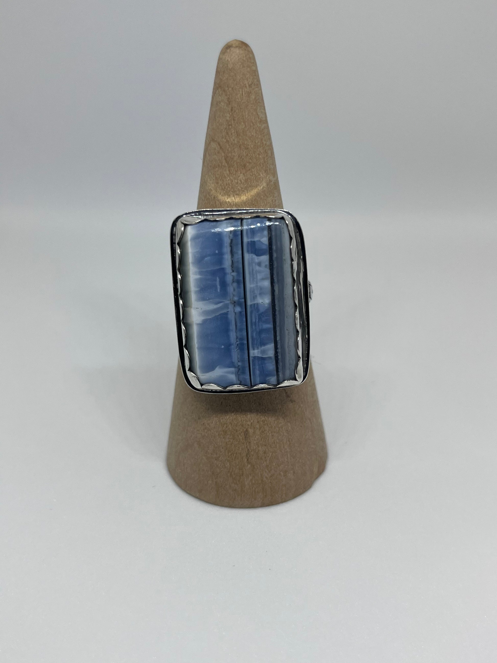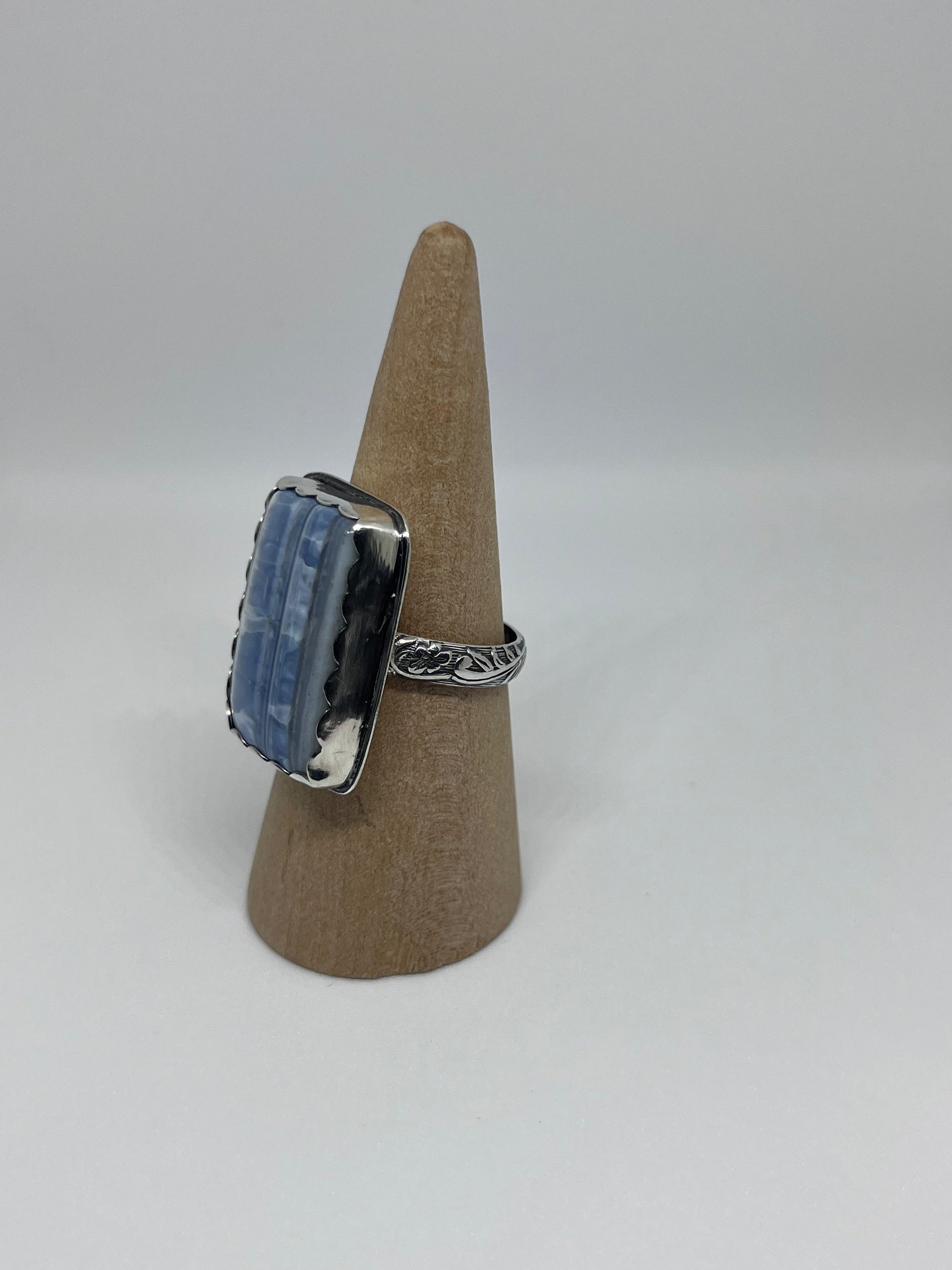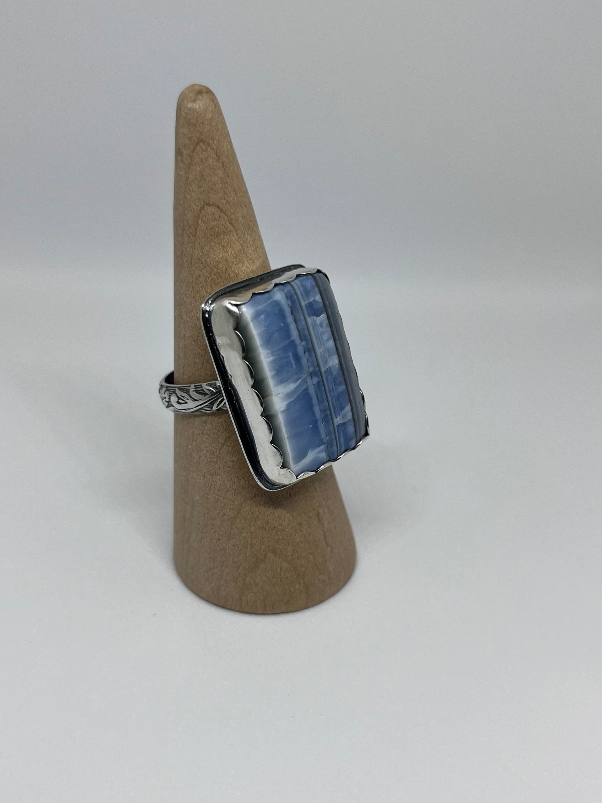 Handmade one of a kind ring featuring a large square Owyhee Blue Opal set in a sterling silver scallop bezel with a 4.0 mm flower band, smooth backplate and a soldered hand stamped makers mark.