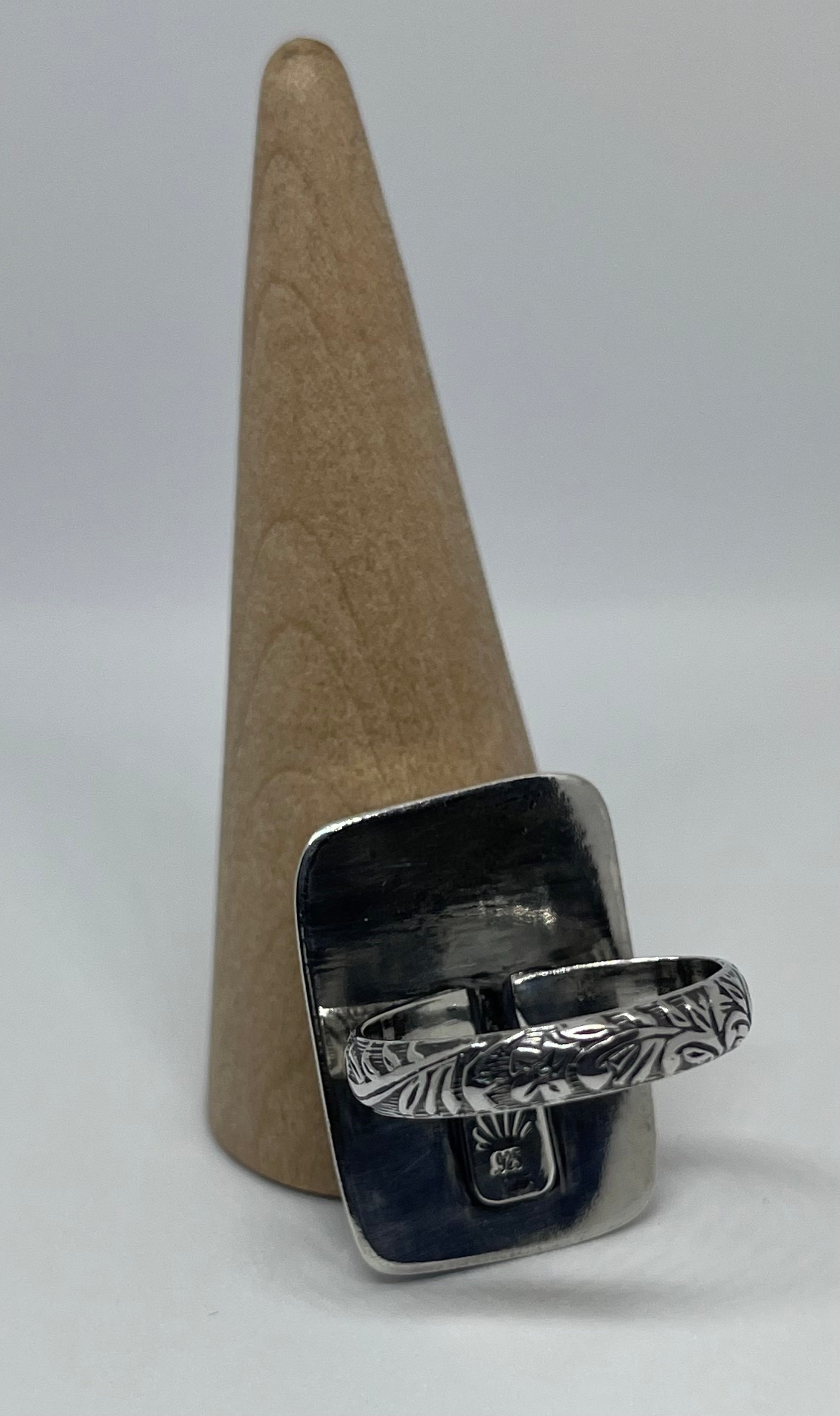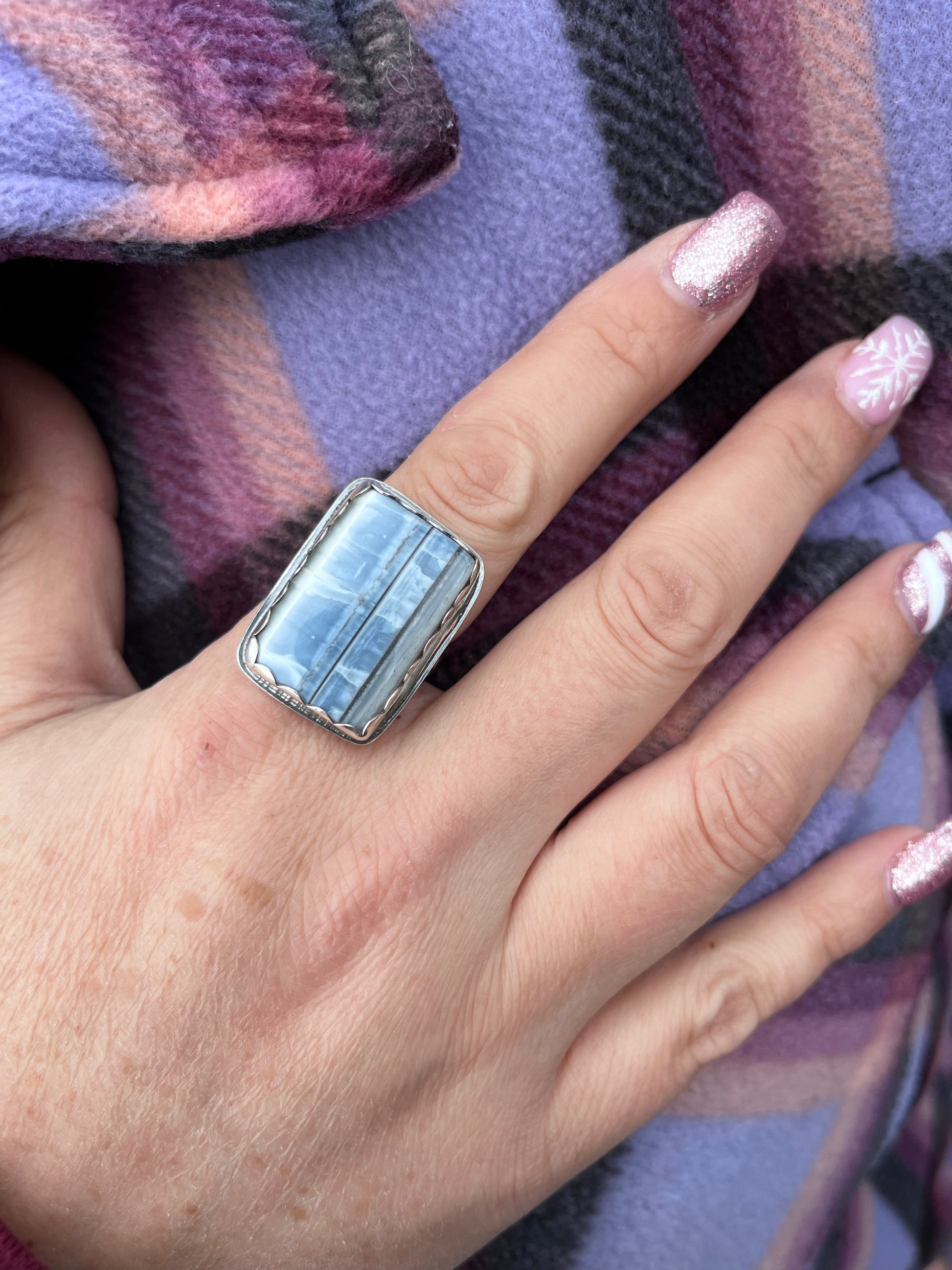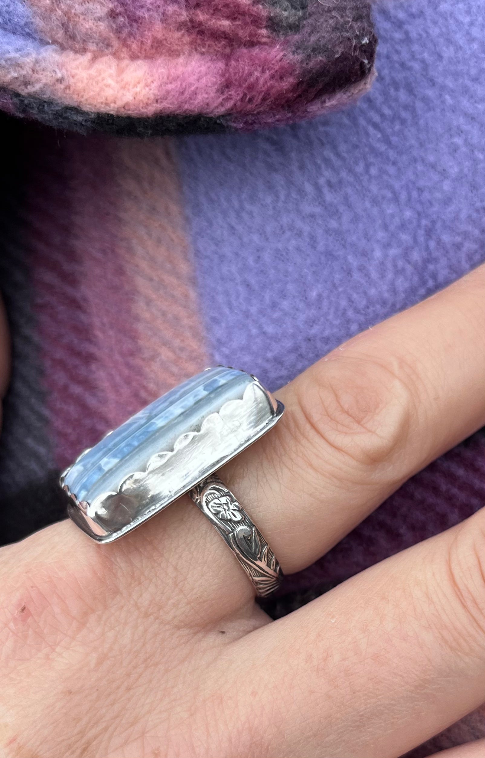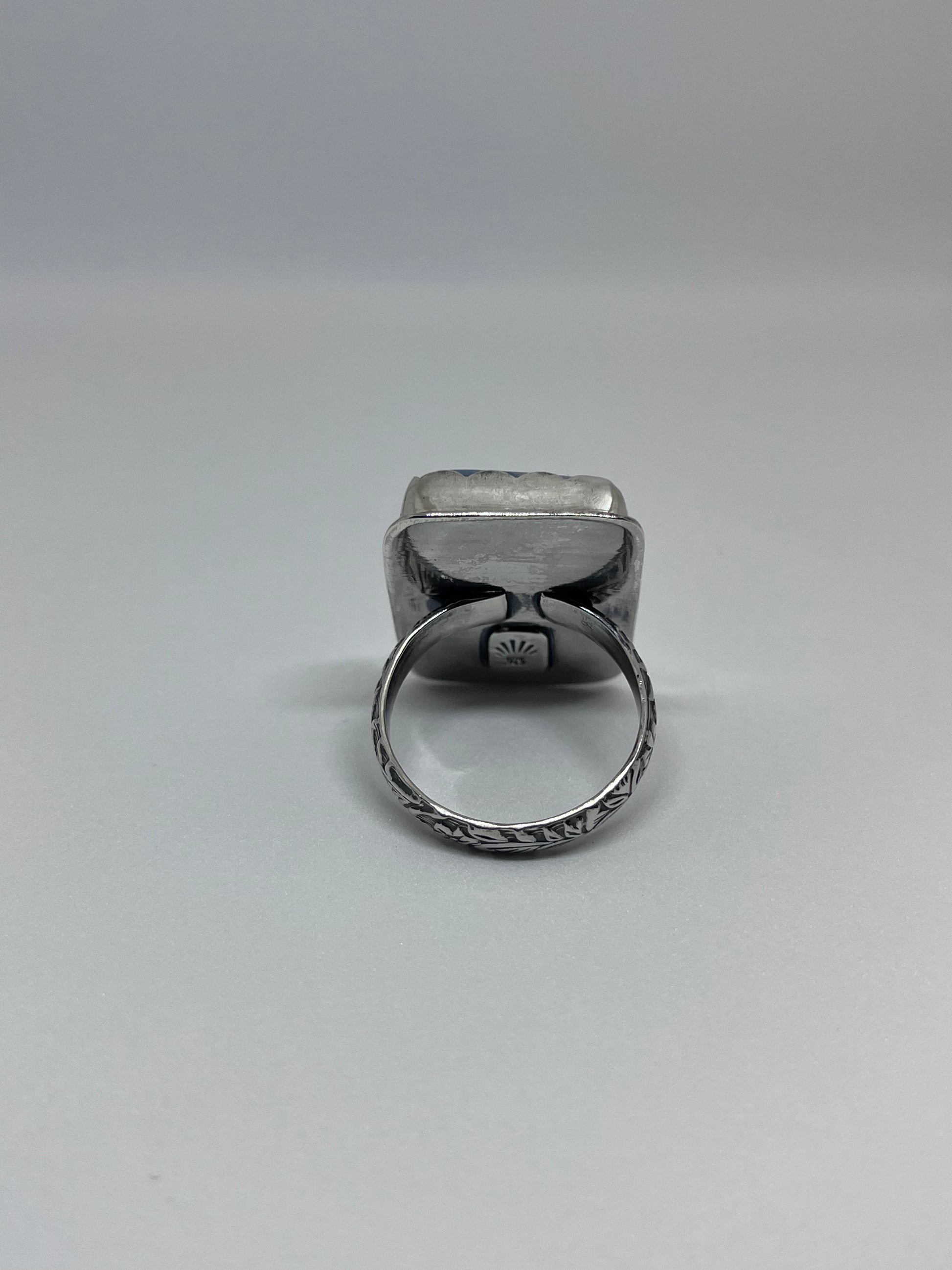 Handmade one of a kind ring featuring a large square Owyhee Blue Opal set in a sterling silver scallop bezel with a 4.0 mm flower band, smooth backplate and a soldered hand stamped makers mark.