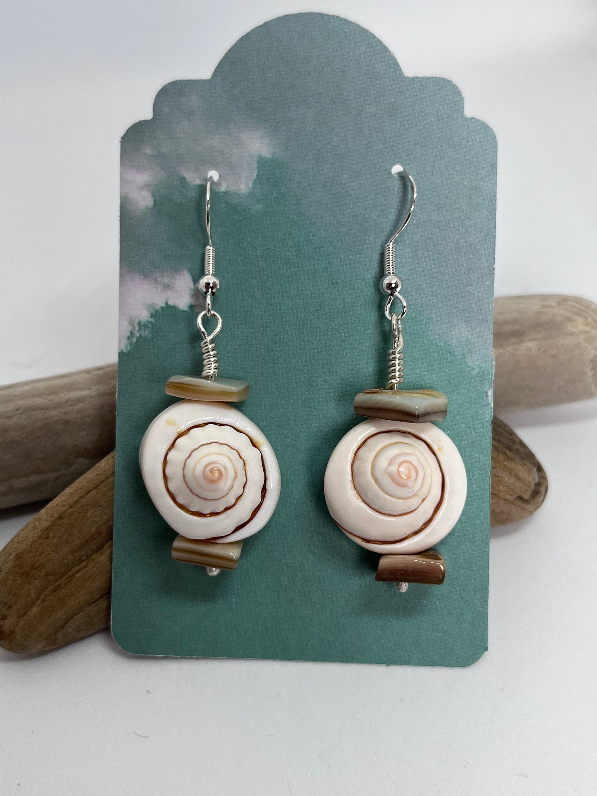 Shive Eye shells wire wrapped in silver and paired with oyster shells.