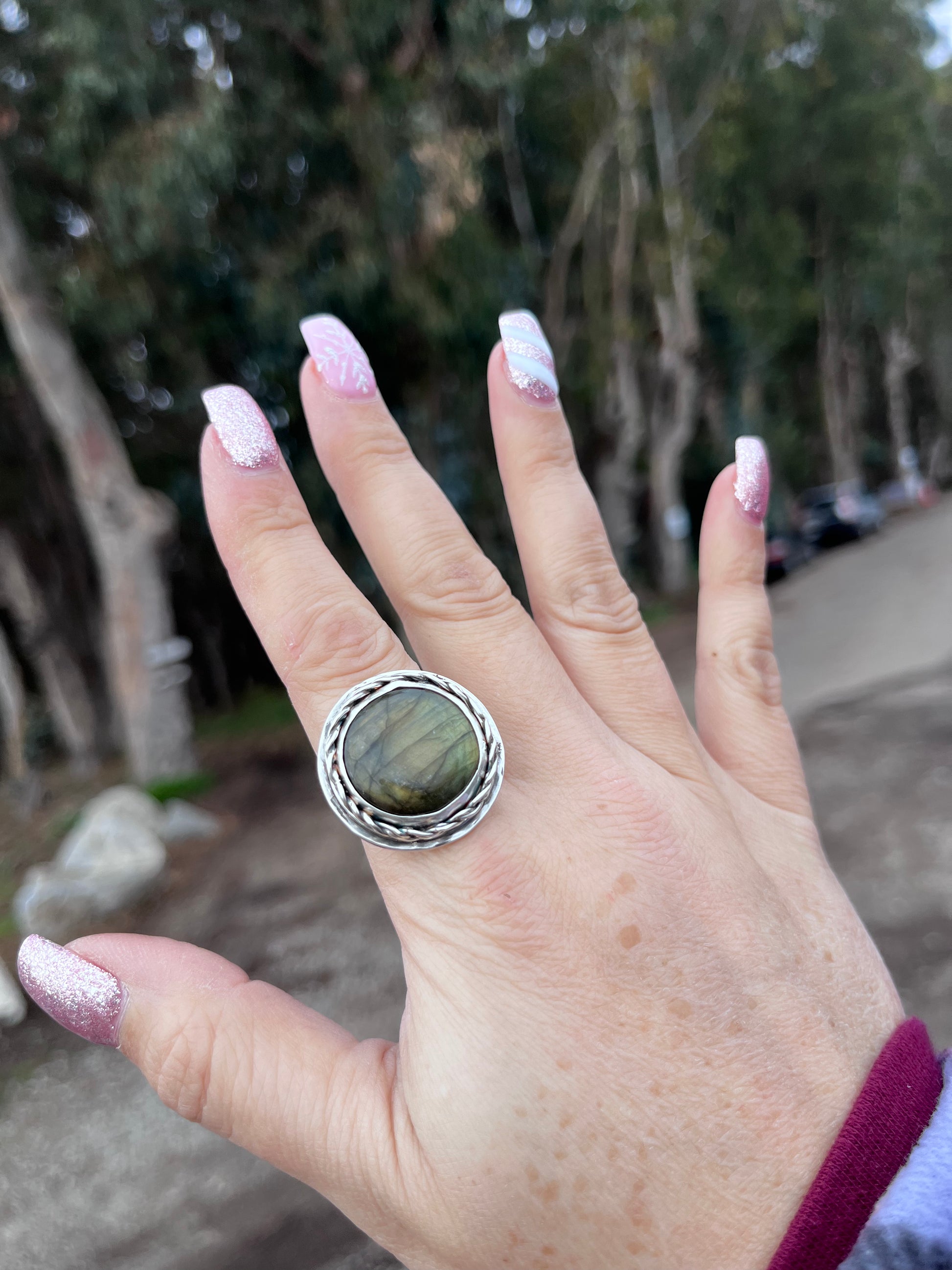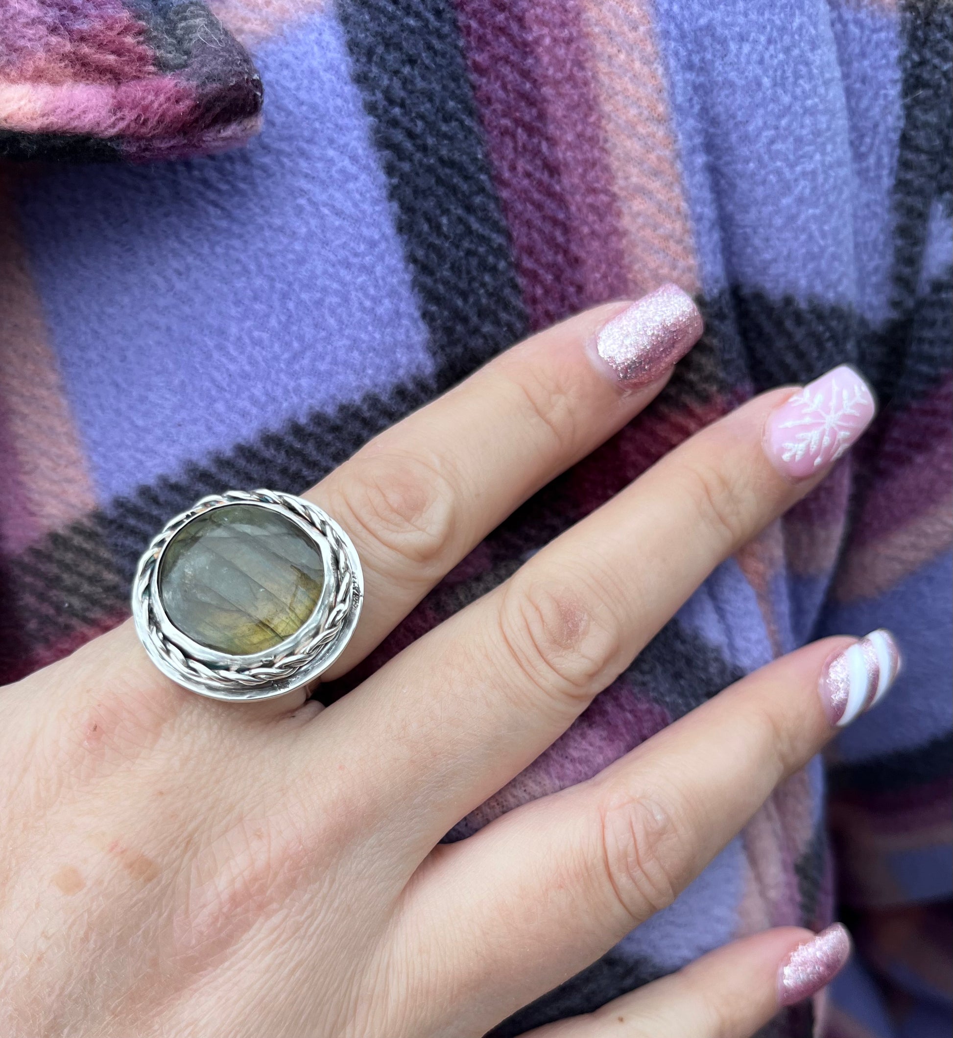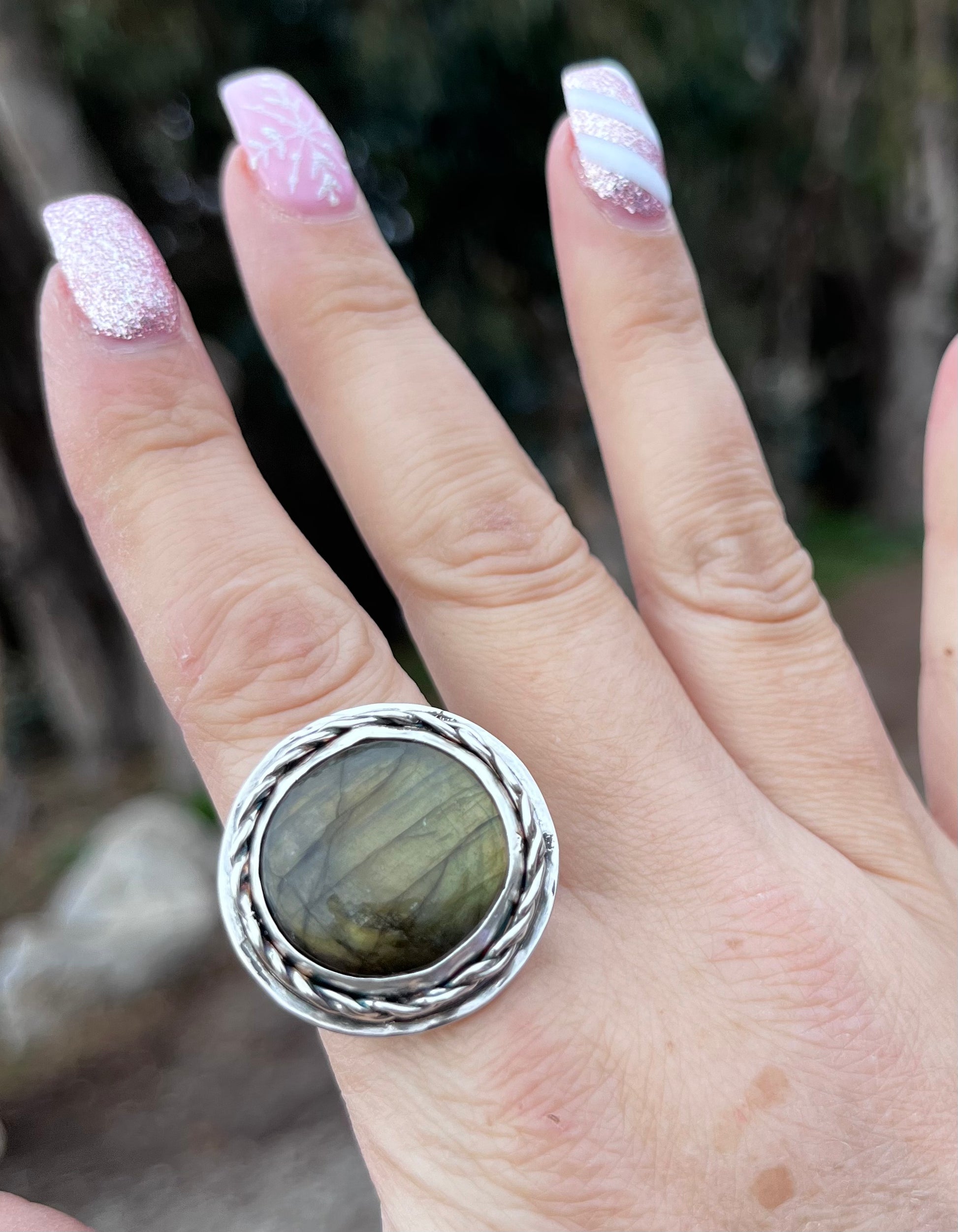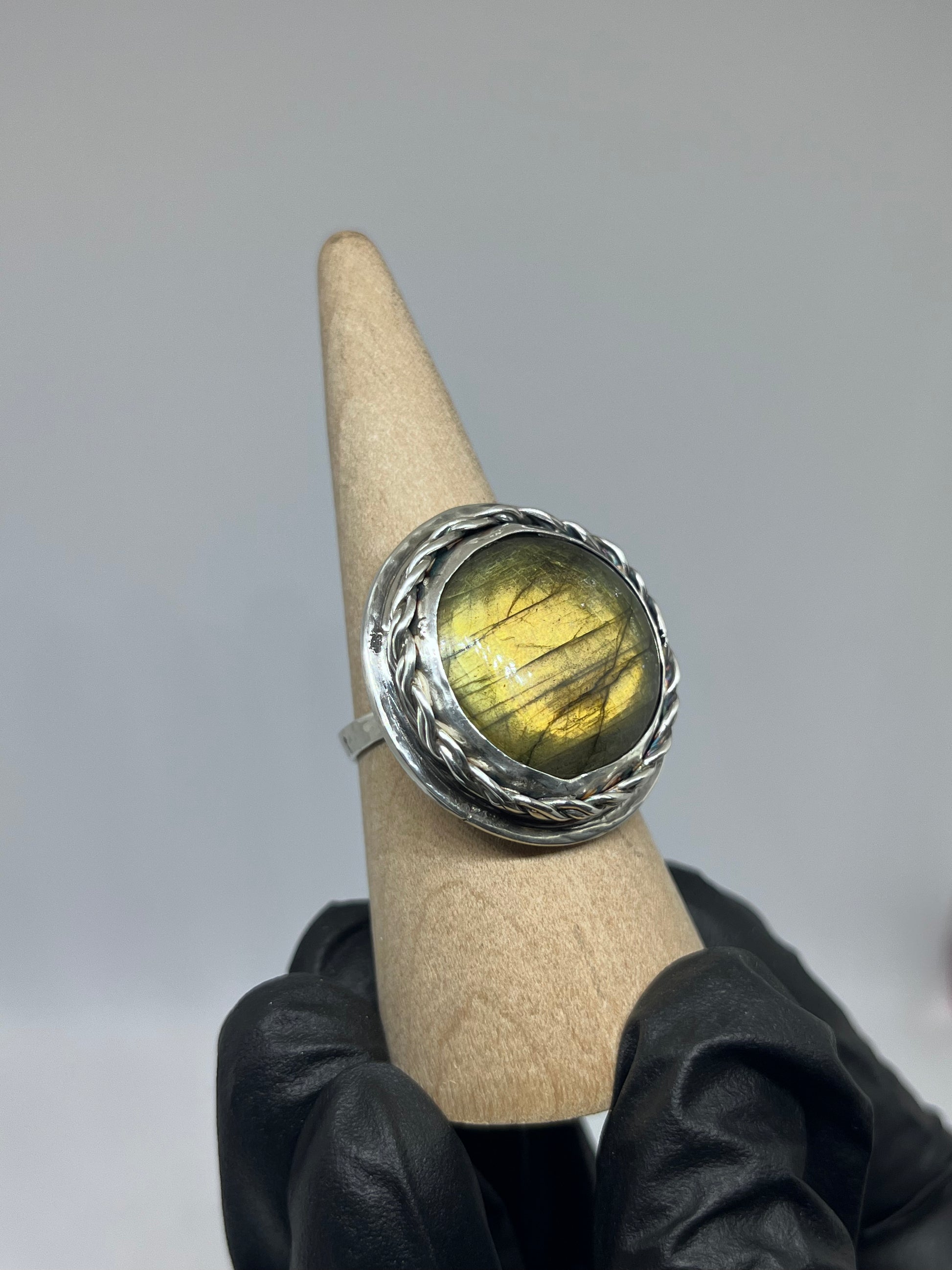 Handcrafted one of a kind ring featuring a yellow Labradorite stone set in a smooth sterling silver bezel with a braided bezel and smooth backplate with a hammered band.